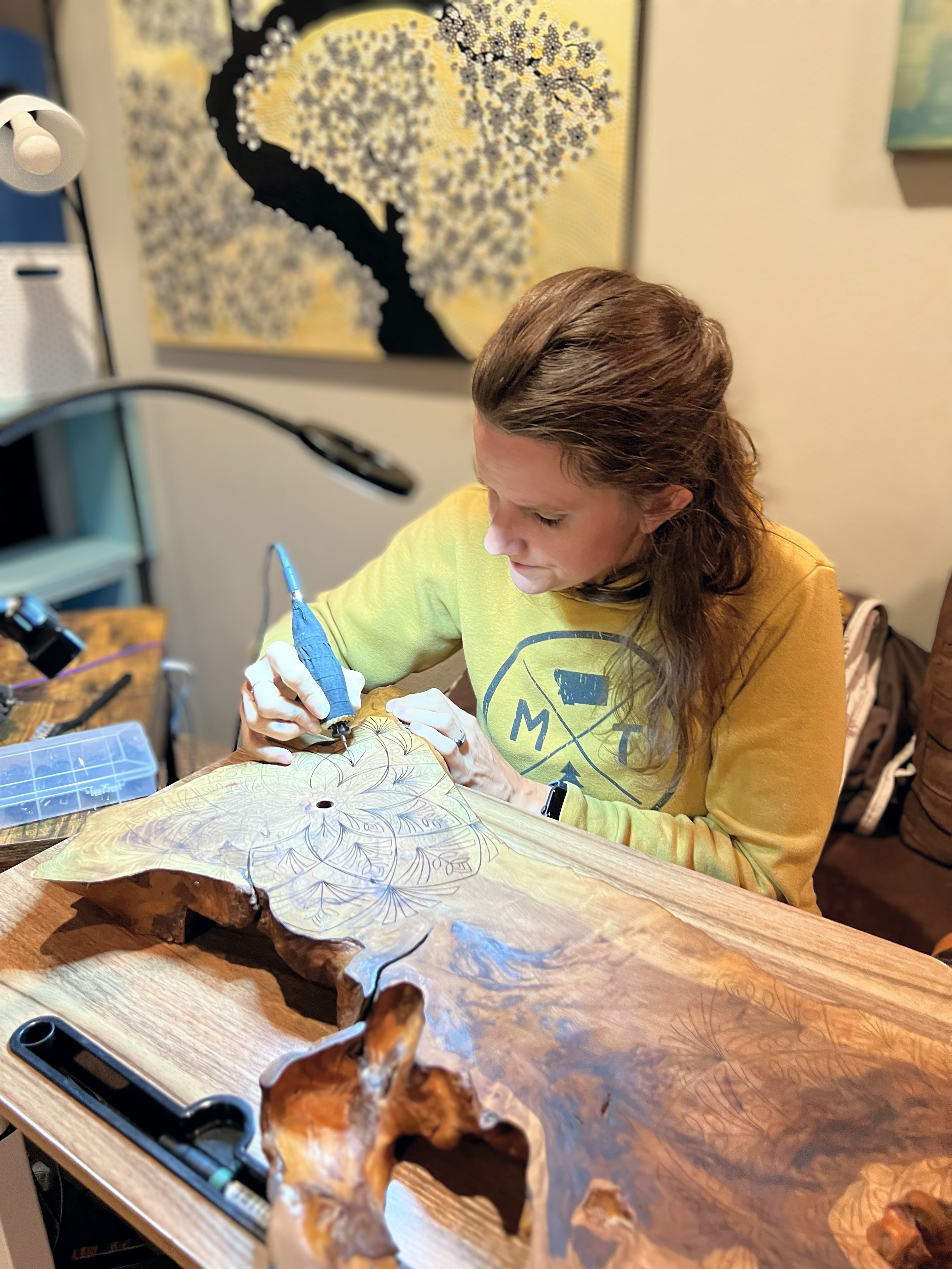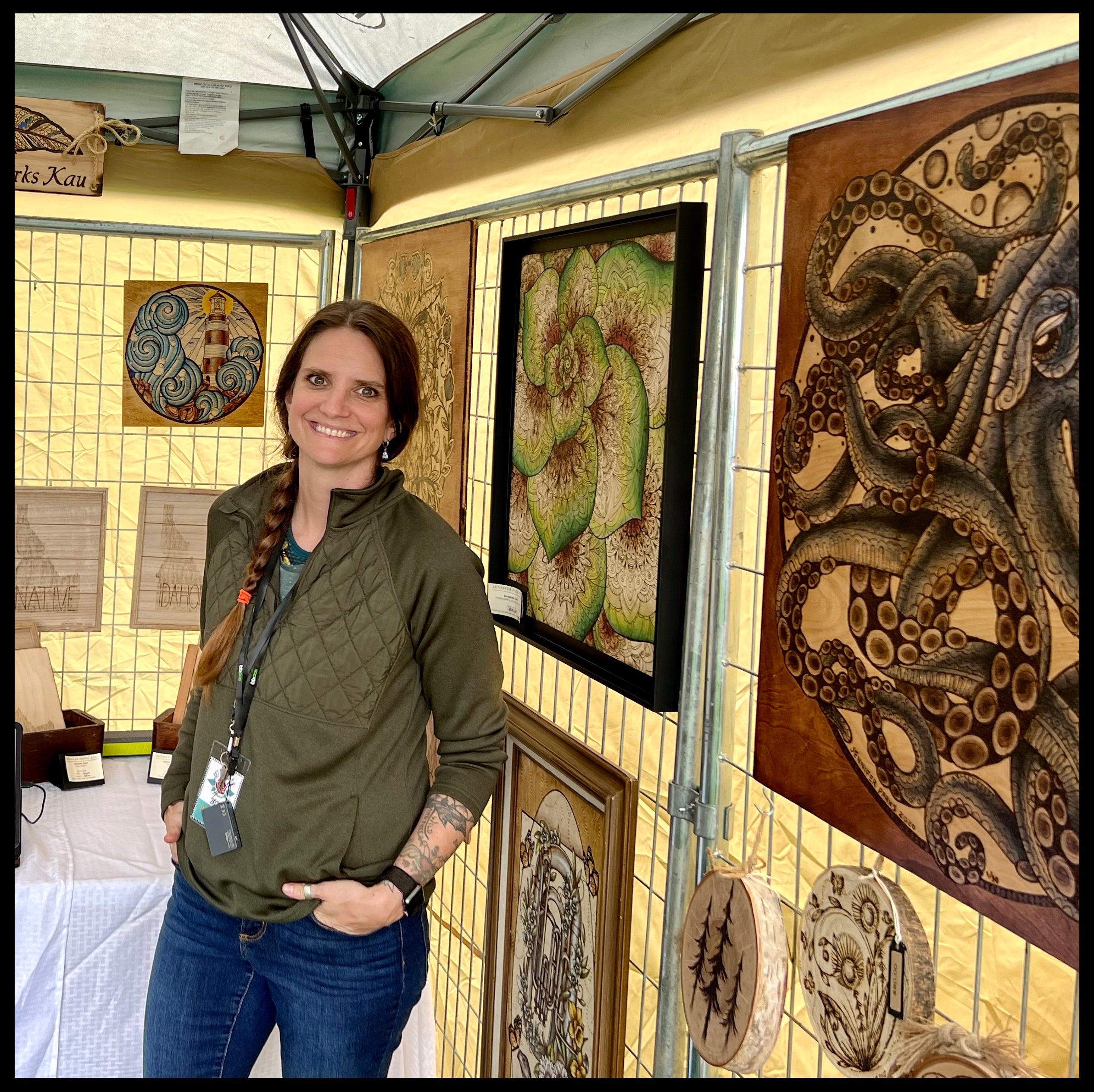 Due to COVID, my new addiction - wood burning - was born. Fast forward to 2022, the first year I have been able to dedicate time to doing my own fine art. I took another leap and entered a booth at The Art & Roses show in Boise, Idaho in June, and then had my first-ever Gallery show in October. I look forward to many more to come. My wood burning work is inspired by nature and details. I love to Zentangle, which is the process of meditation through doodling. Drawn to nature’s art, I’m inspired by letting the wood grain show through my work.