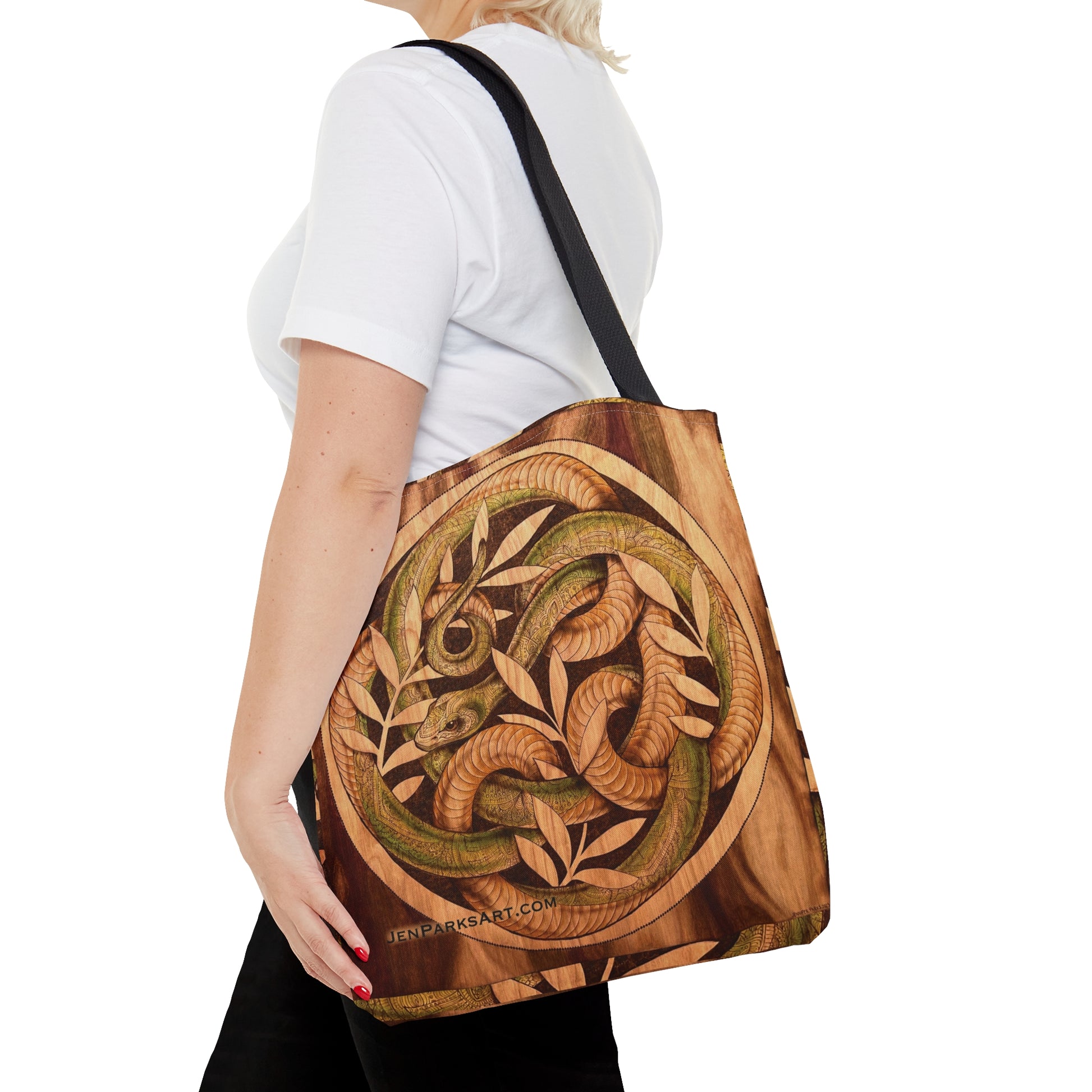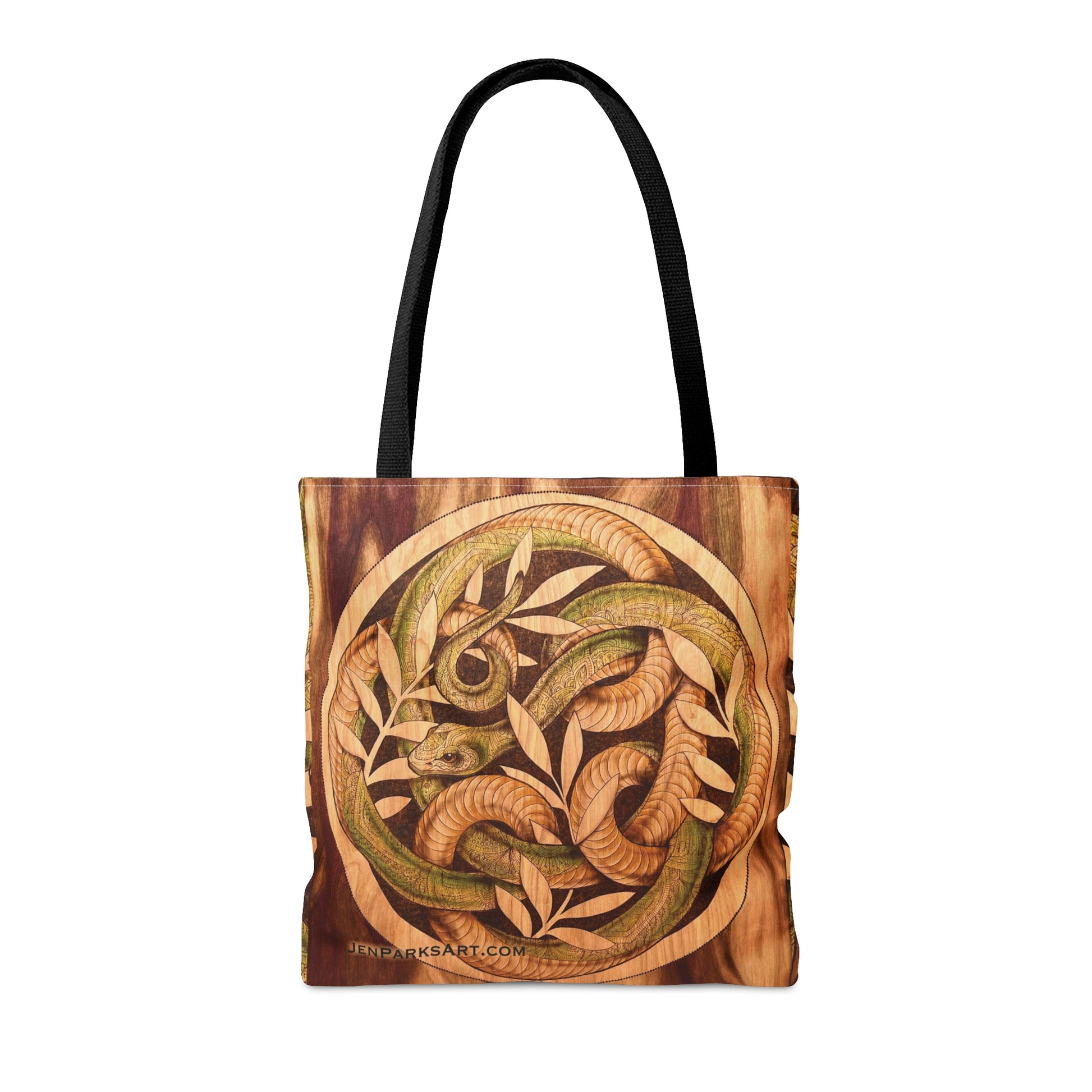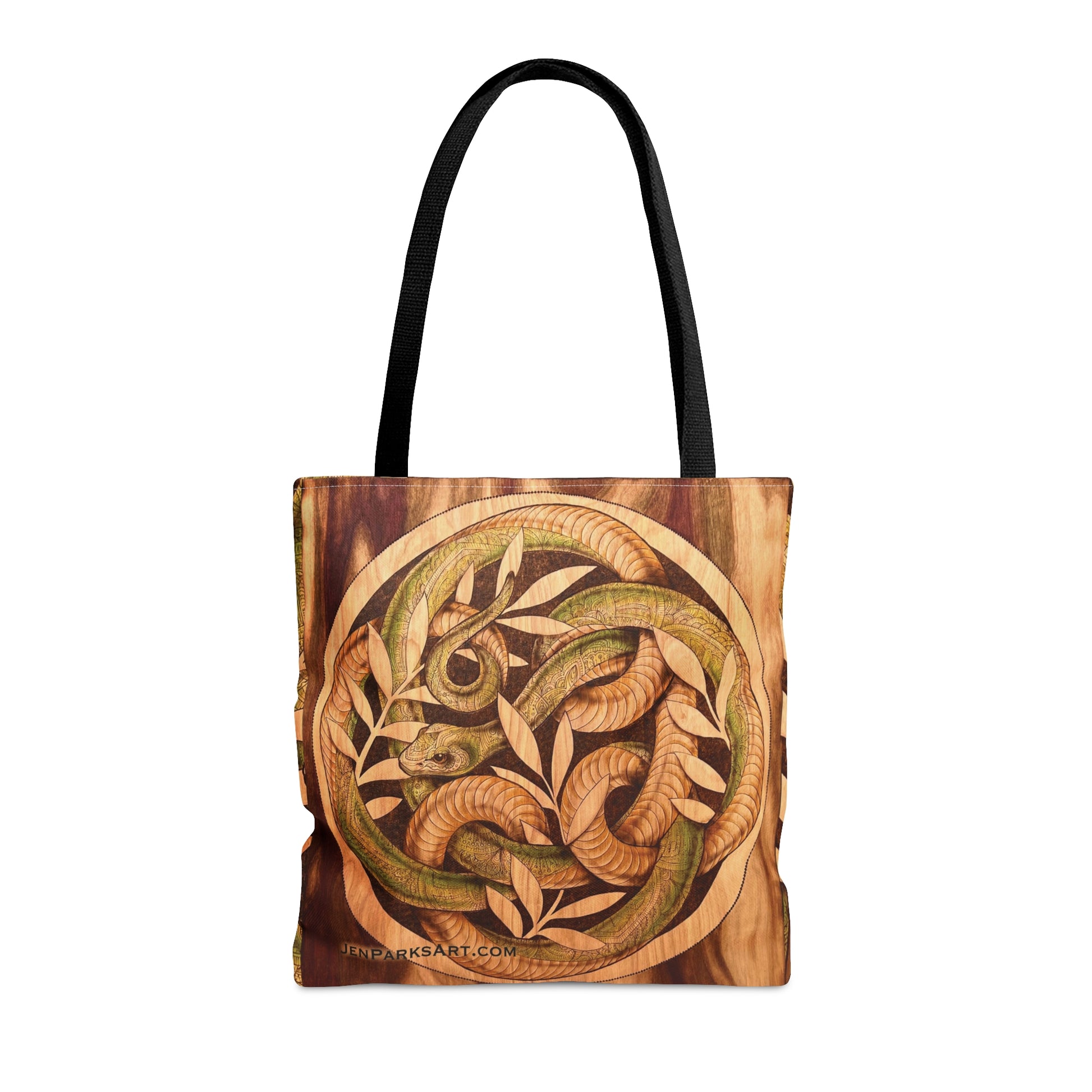 This bag features Jen's original artwork "Eden's Garden." This peice was created with Pyrography, wood stain, and alcohol markers.