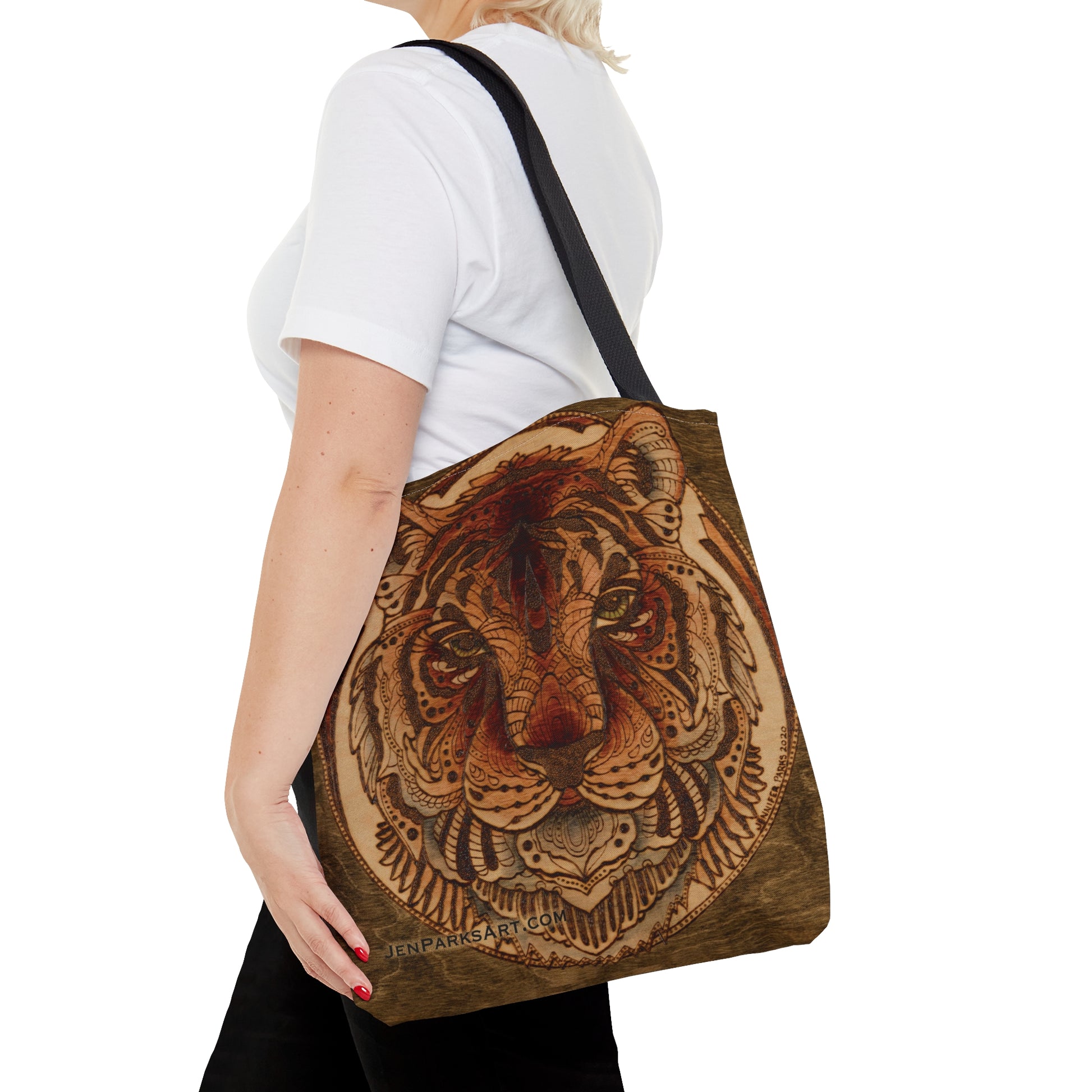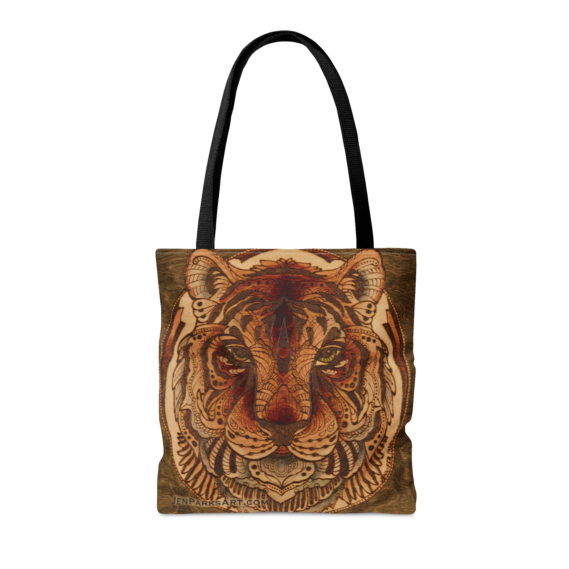 This bag features Jen's original artwork "Eye of the Tiger." This peice was created with Pyrography, wood stain, and alcohol markers.