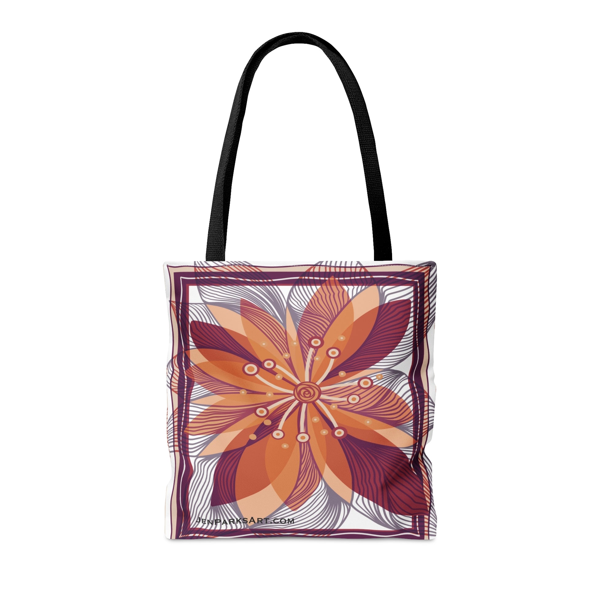 This bag features Jen's original artwork "Fall Flower." This piece is a part of her digital flow series.