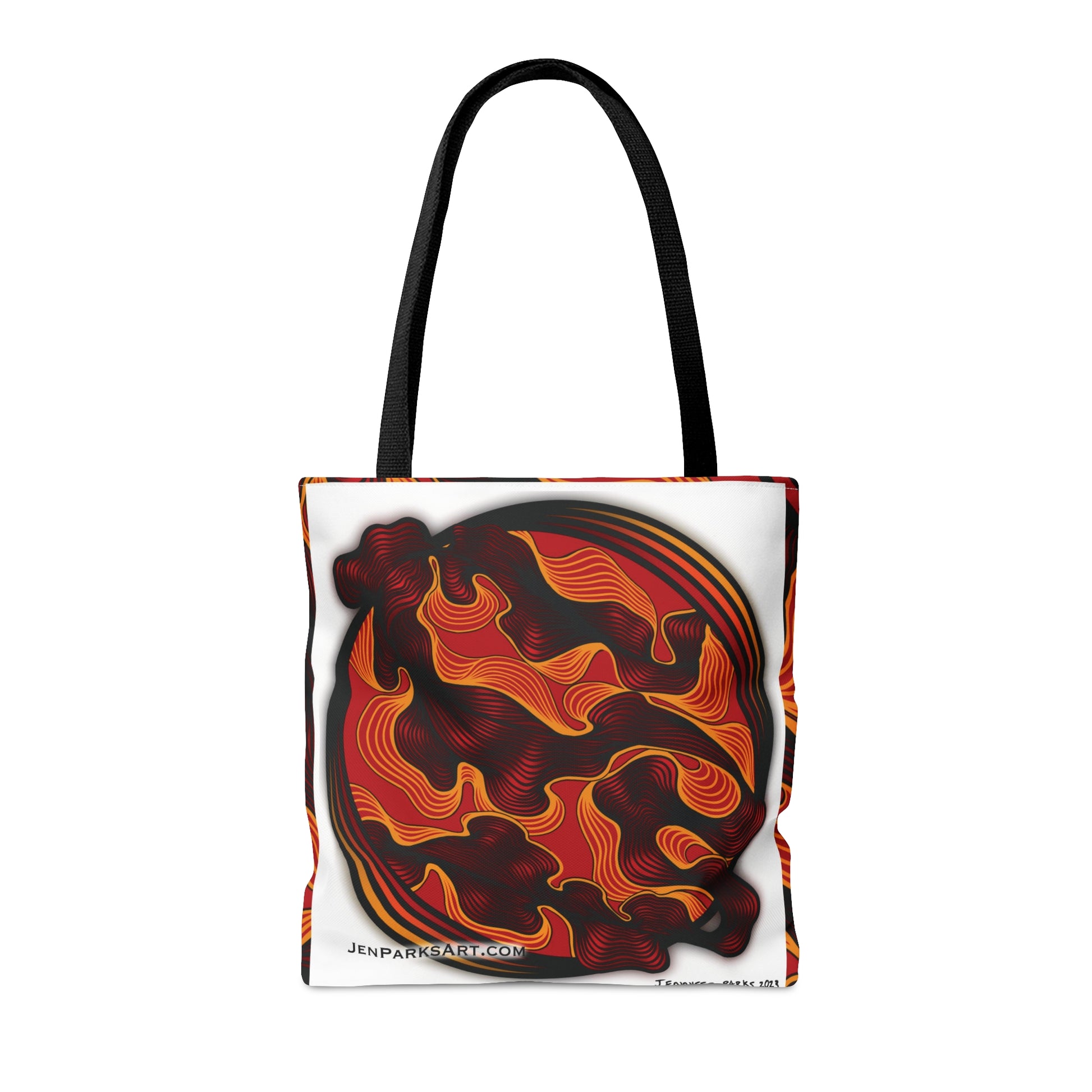 This bag features Jen's original artwork "Fire Dance Flow." This piece is a part of her digital flow series.
