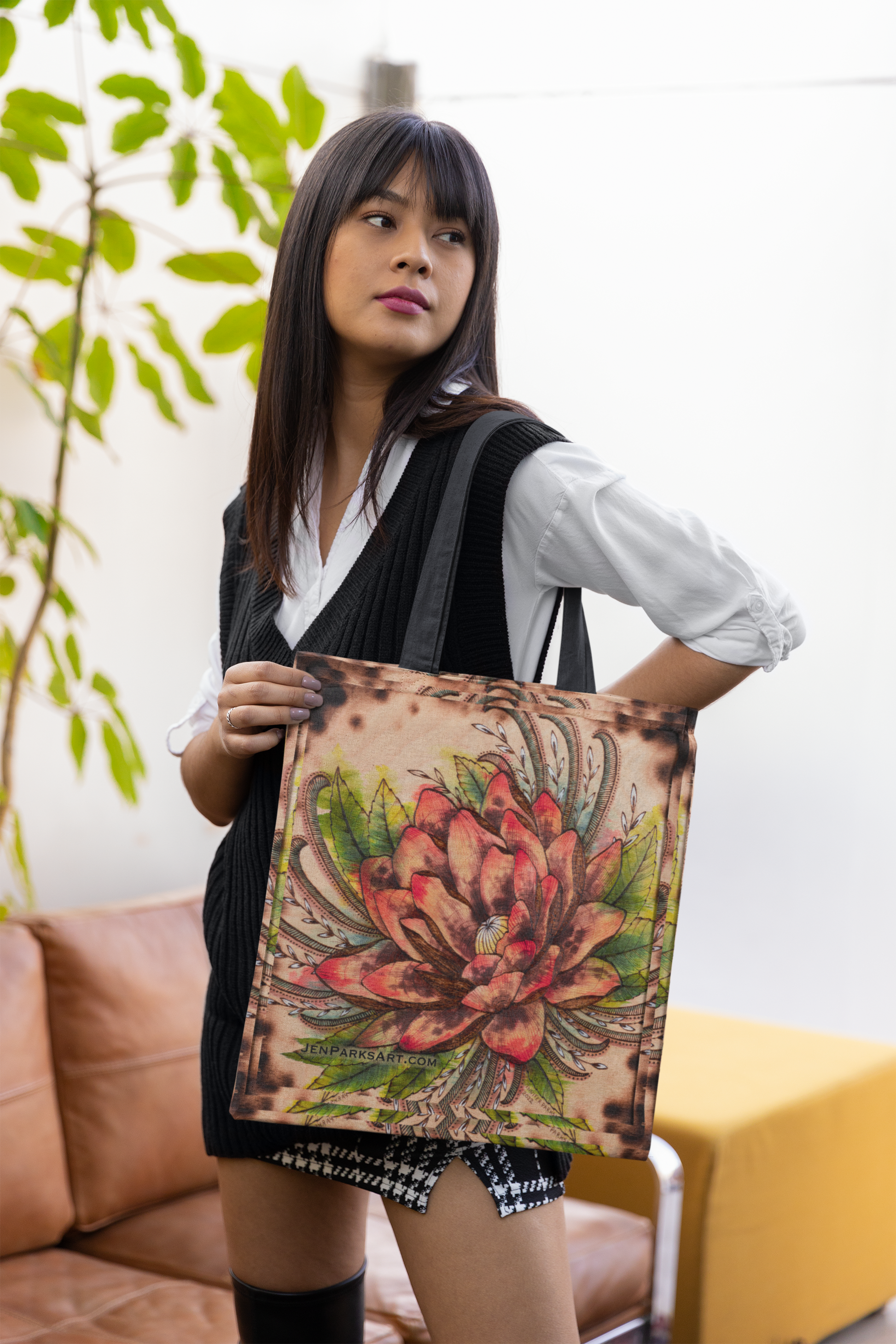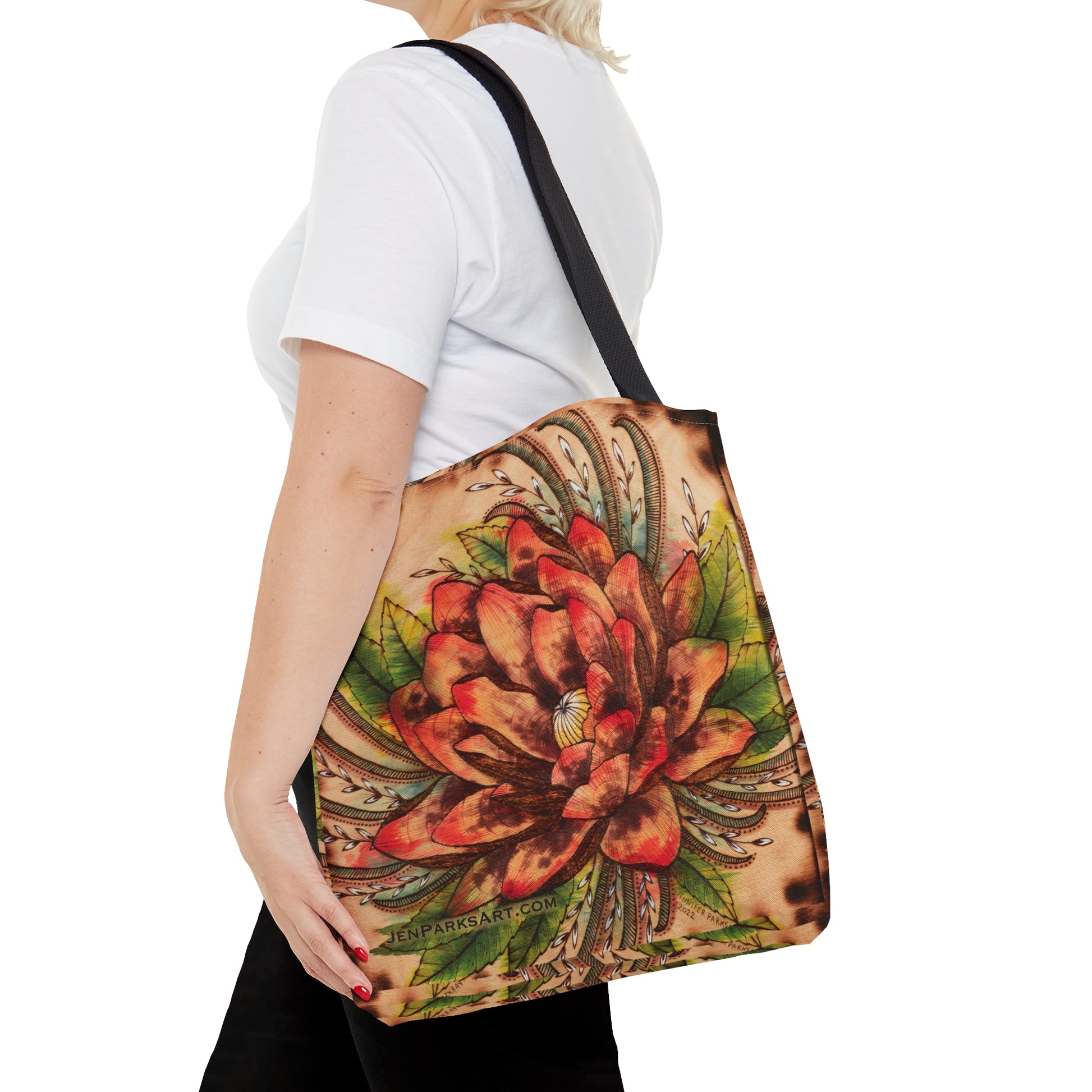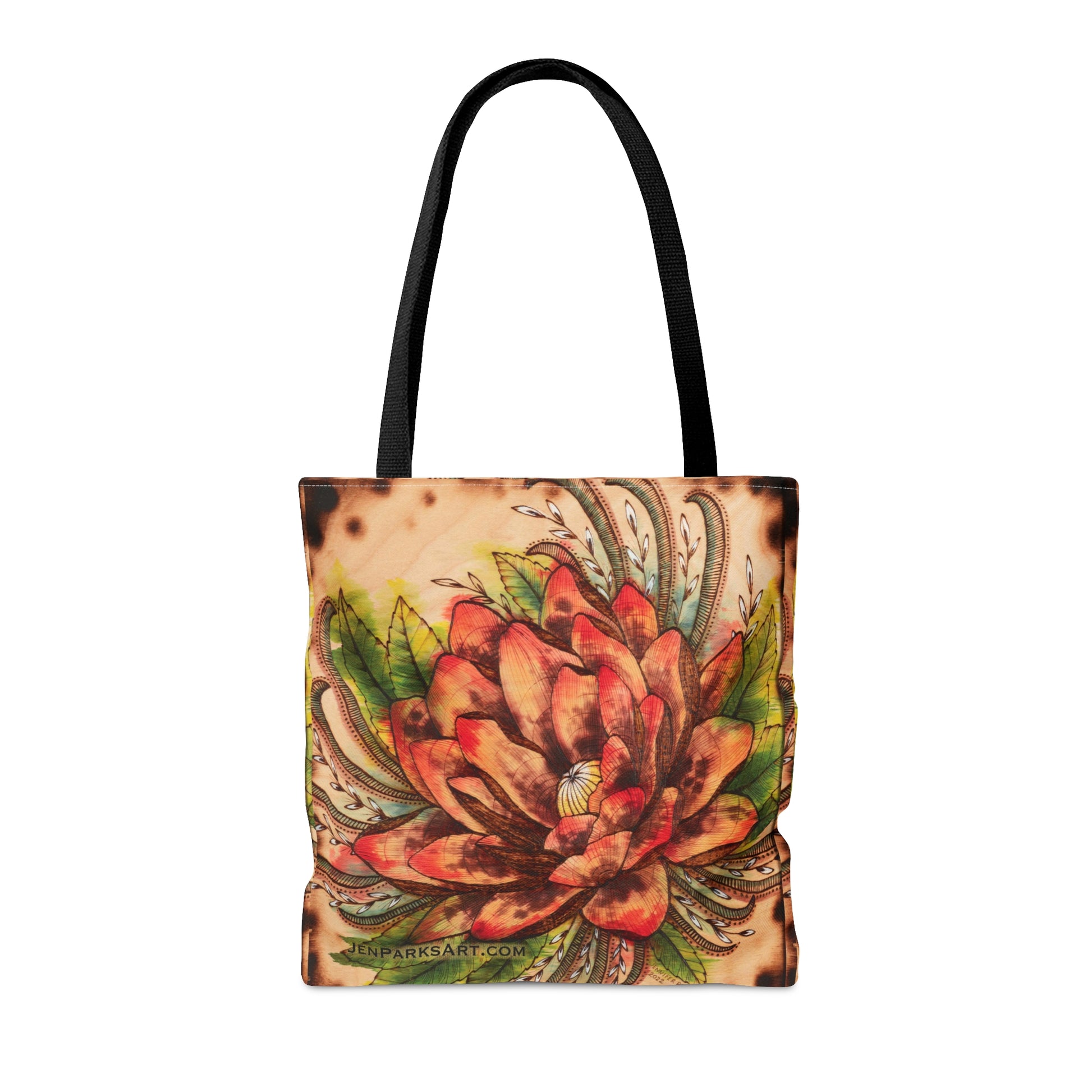 This bag features Jen's original artwork "Fire Flower" This peice was created with Pyrography and watercolor.