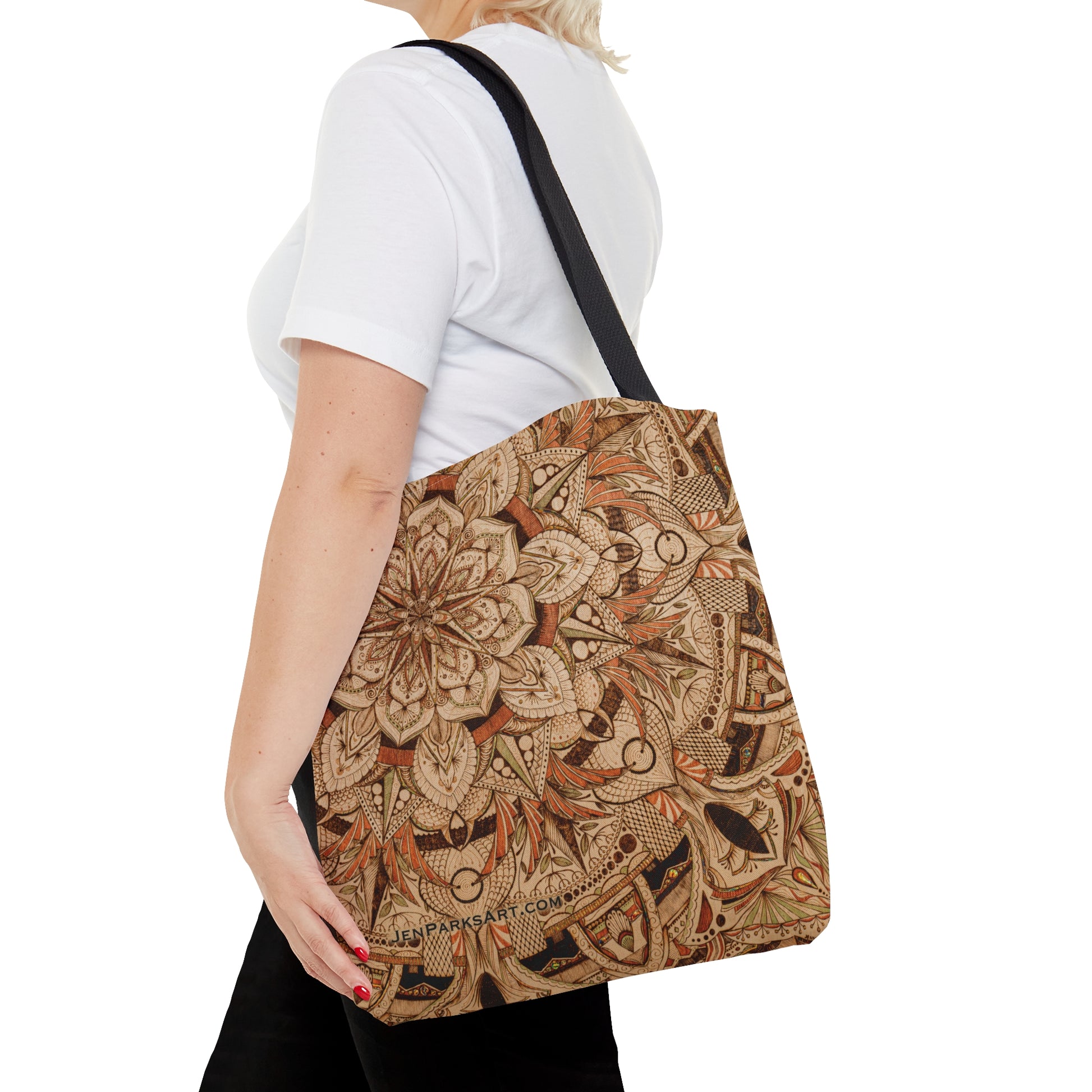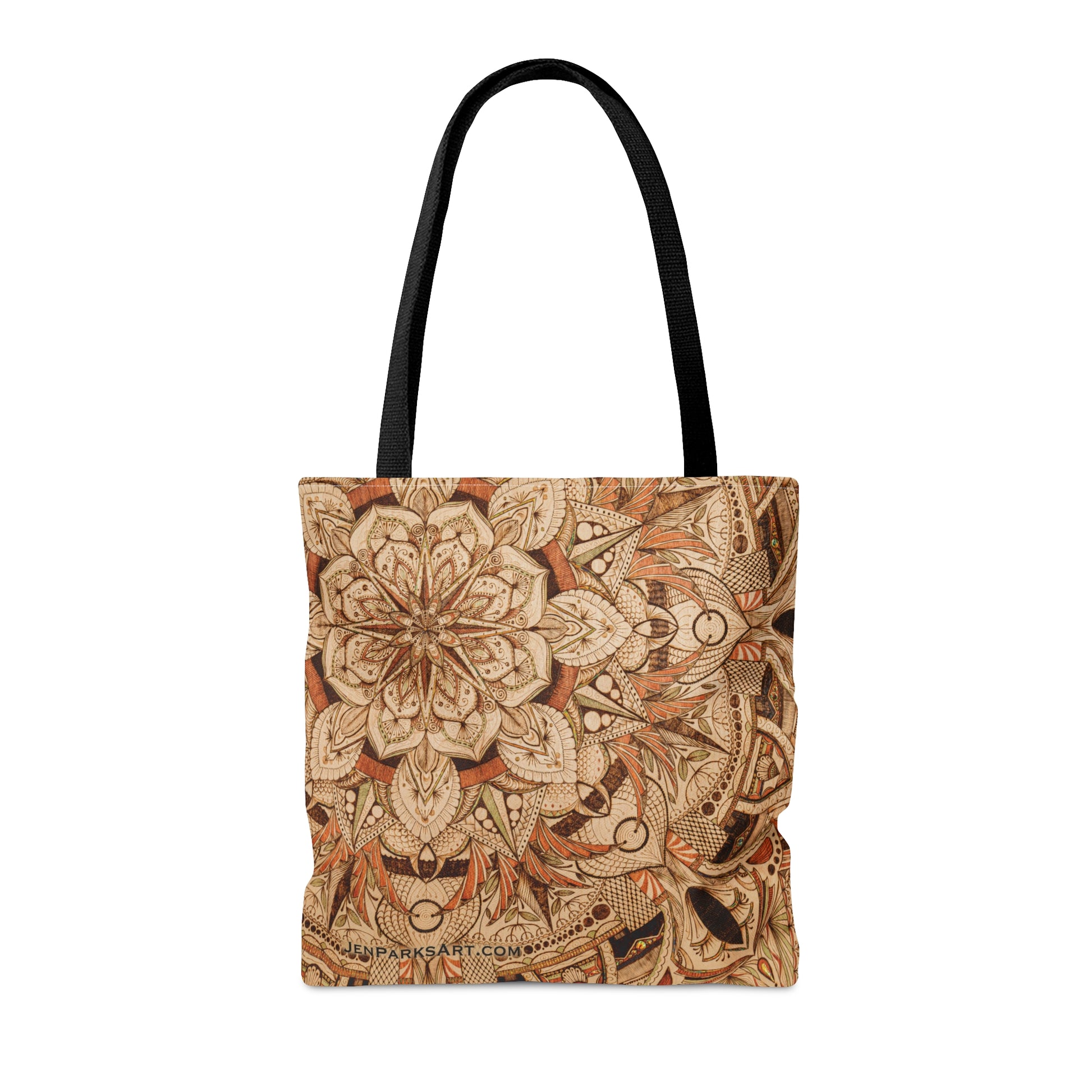This bag features Jen's original artwork "Touch Me Mandala " This peice was created with Pyrography, wood stain, and foil.
