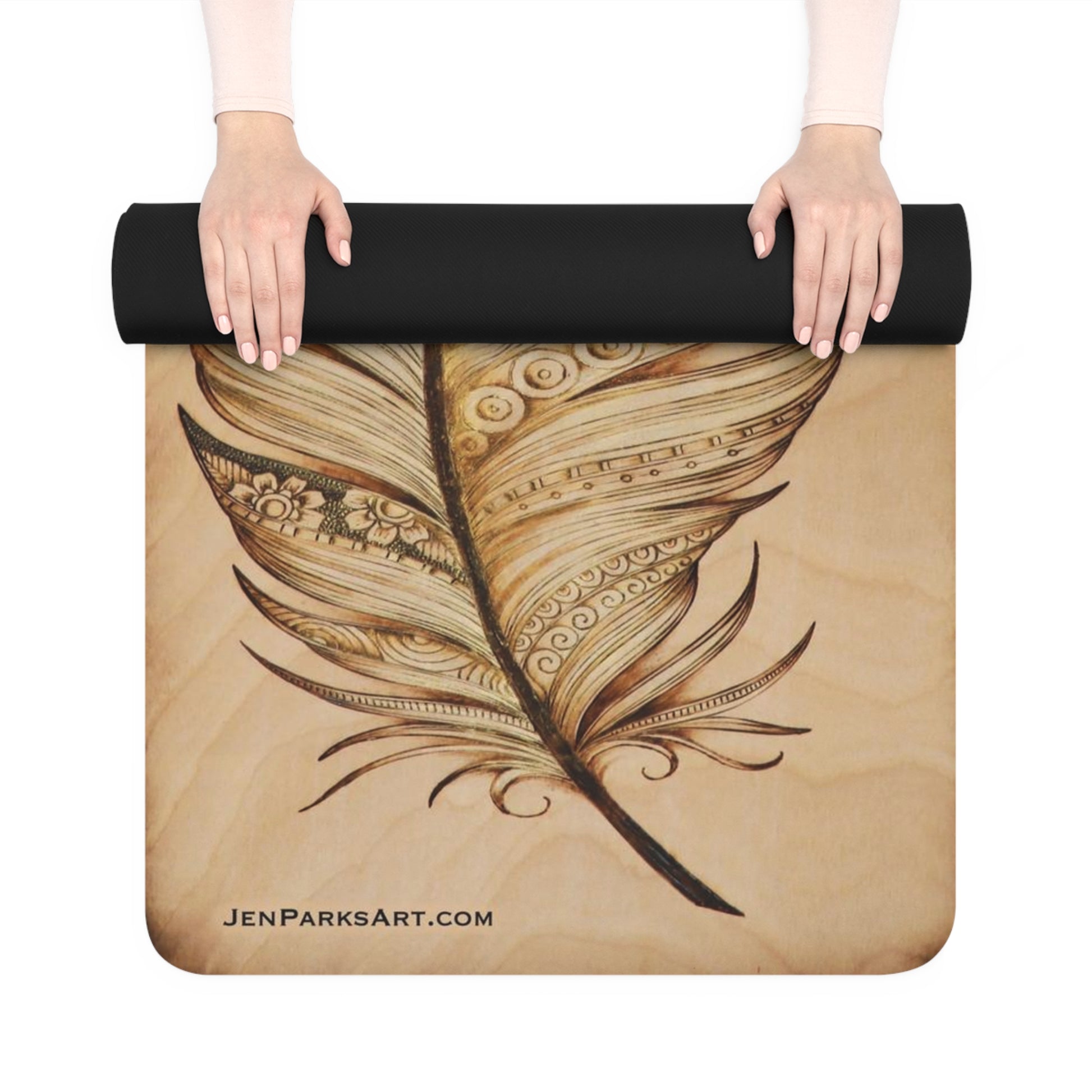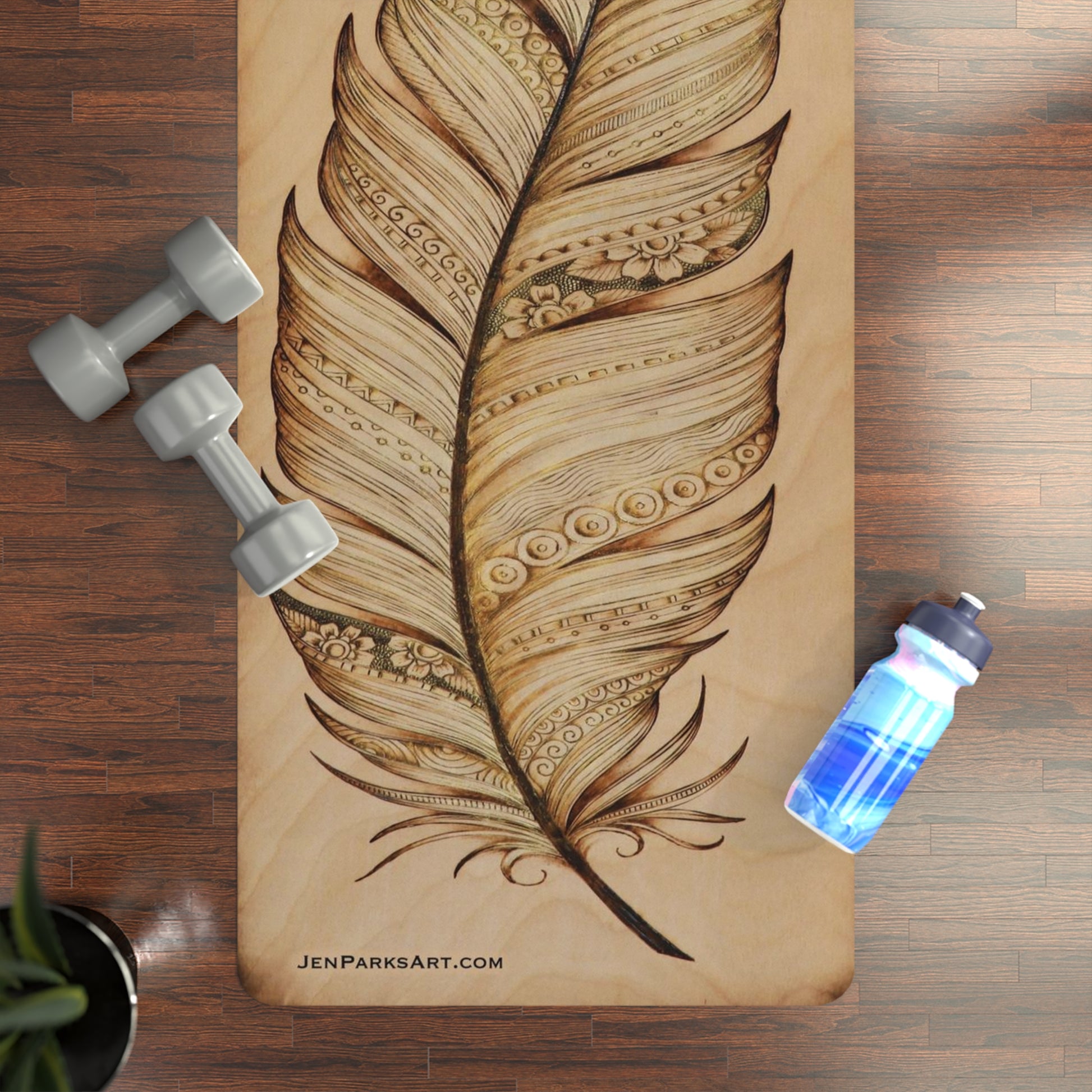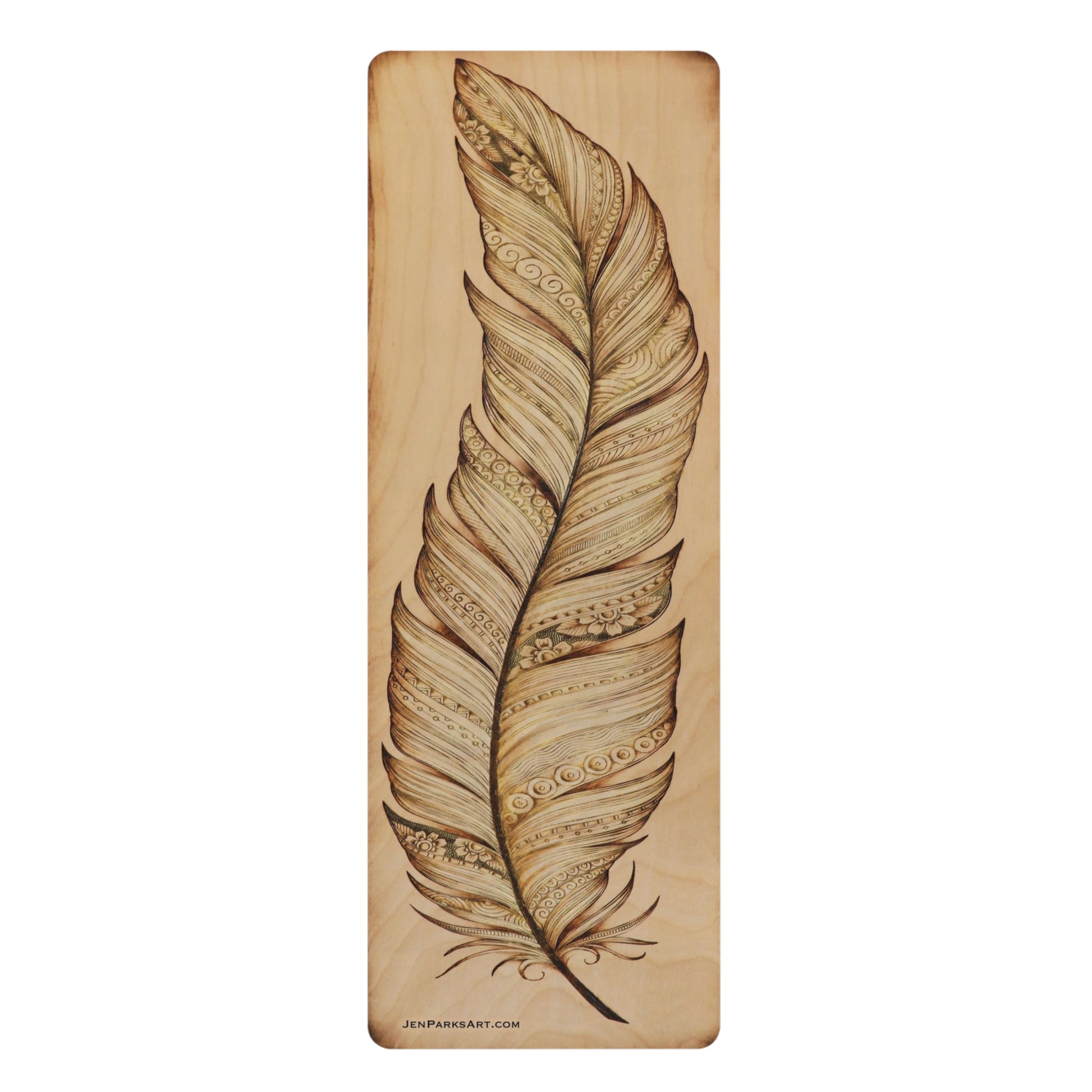 This mat features Jen's original artwork "Golden Feather" This piece was created by using pyrography and metalic watercolor.