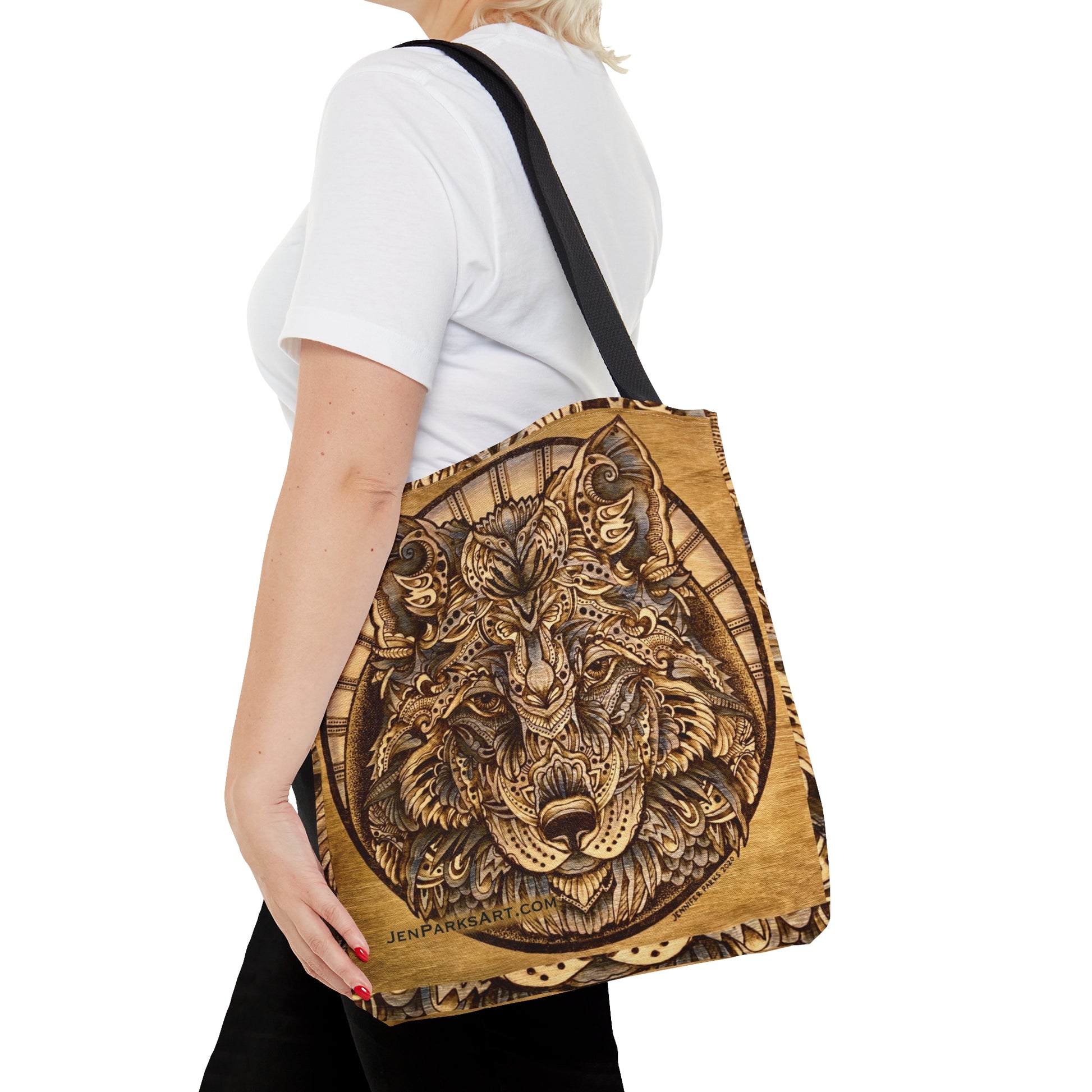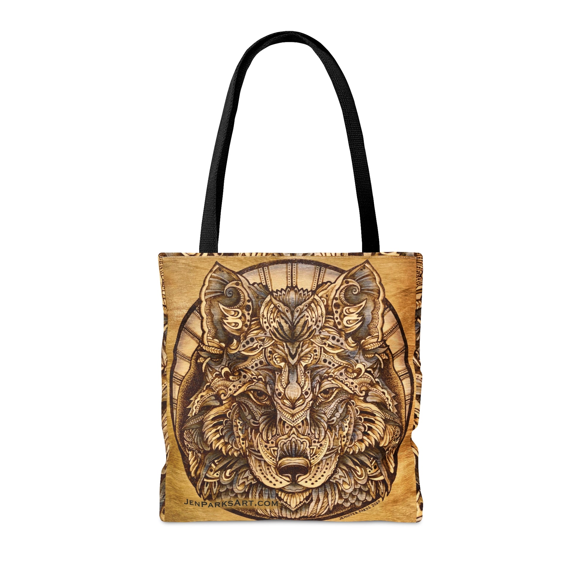 This bag features Jen's original artwork "Lone Wolf" This peice was created with Pyrography and wood stain.