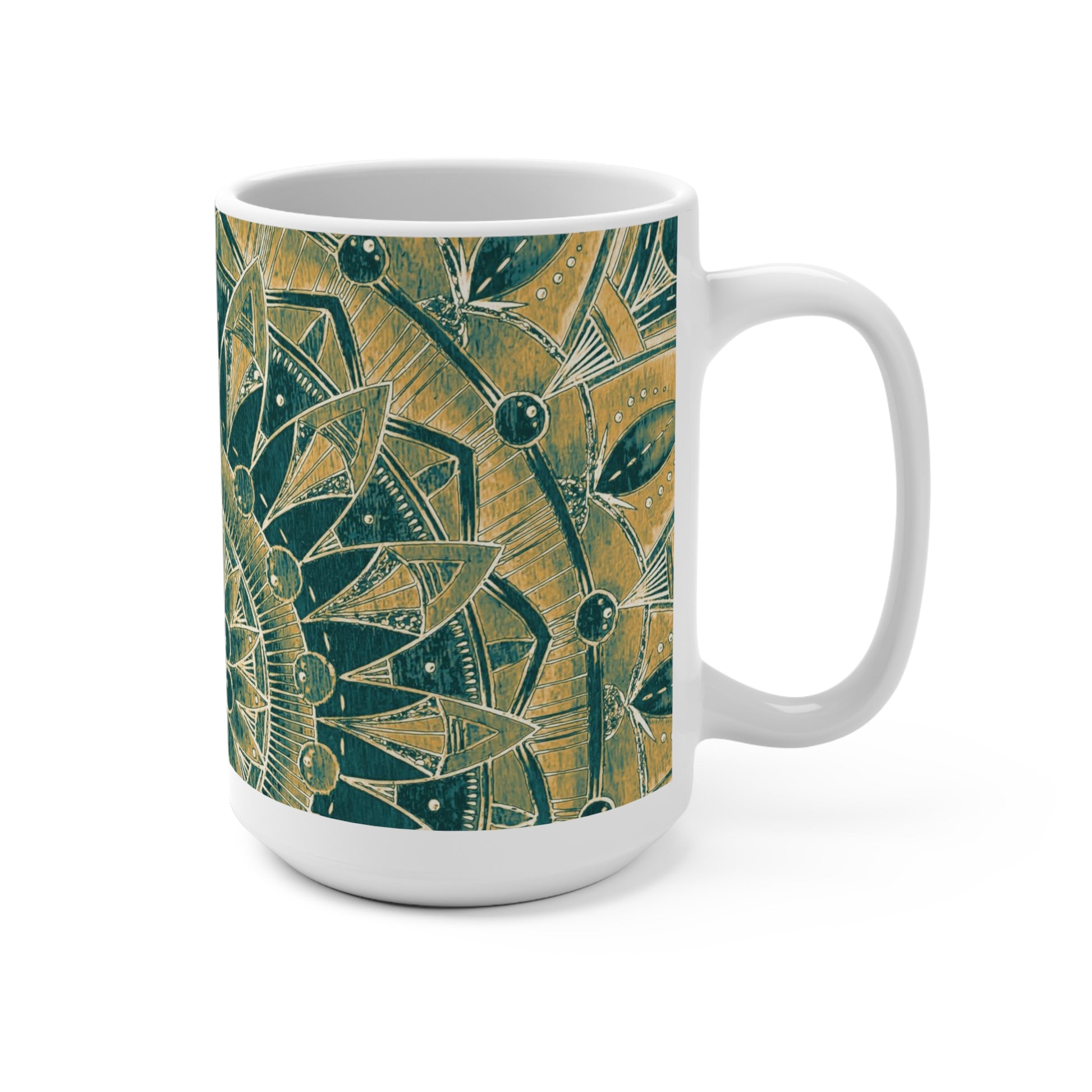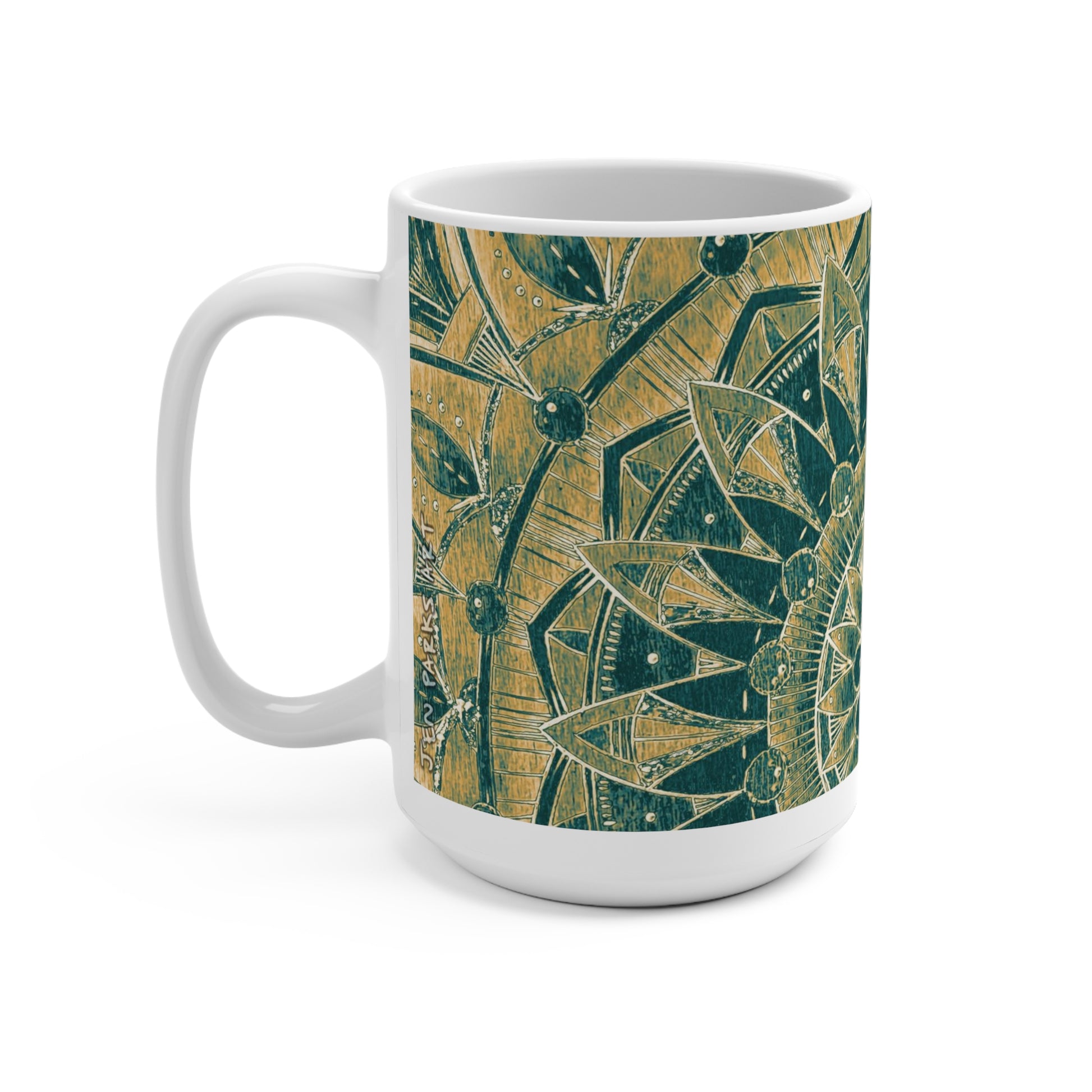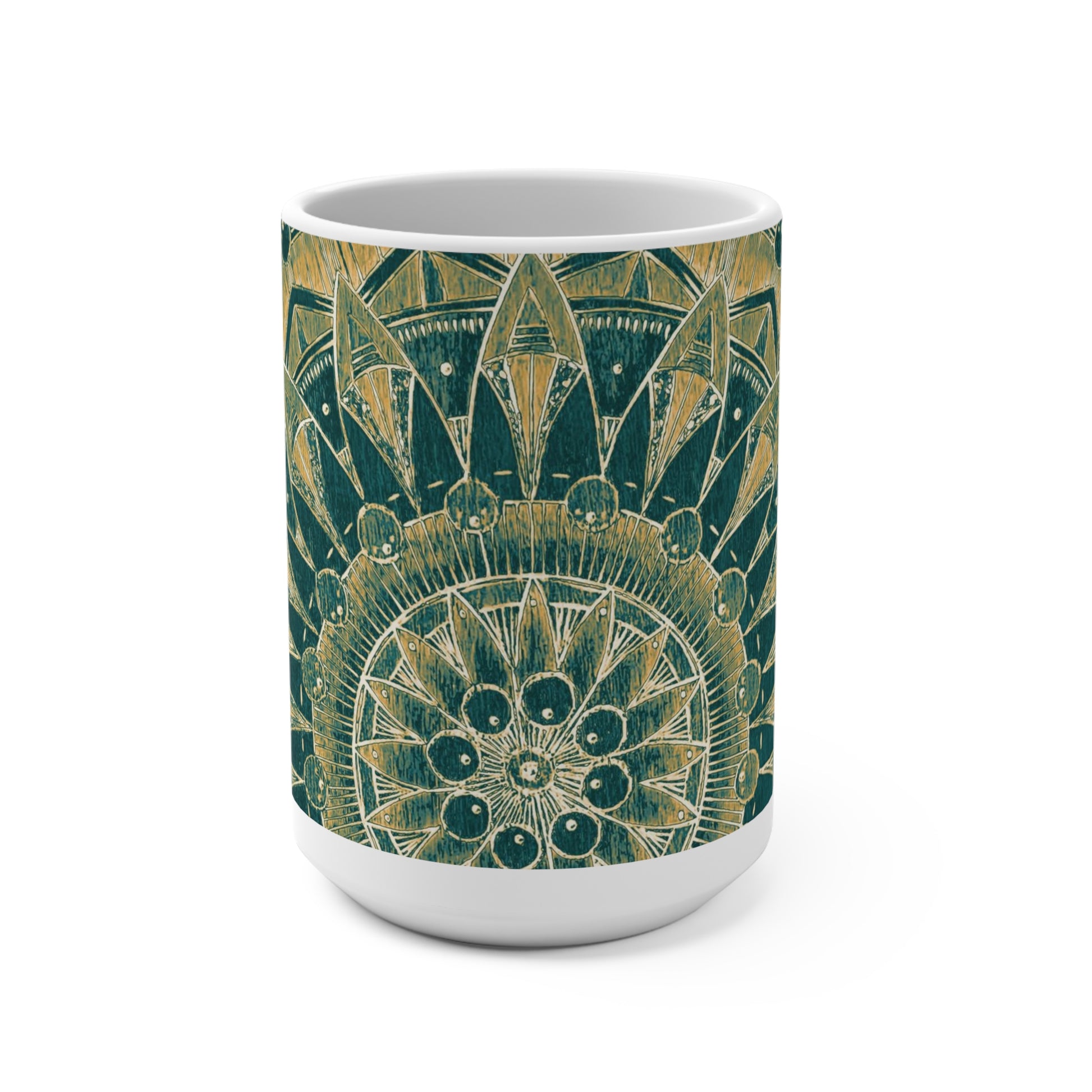 This mug is 1 of 4 of Jen's Mandala Mug Series. Each mug features a digital modification of Jen's original artwork " Sun Mandala".