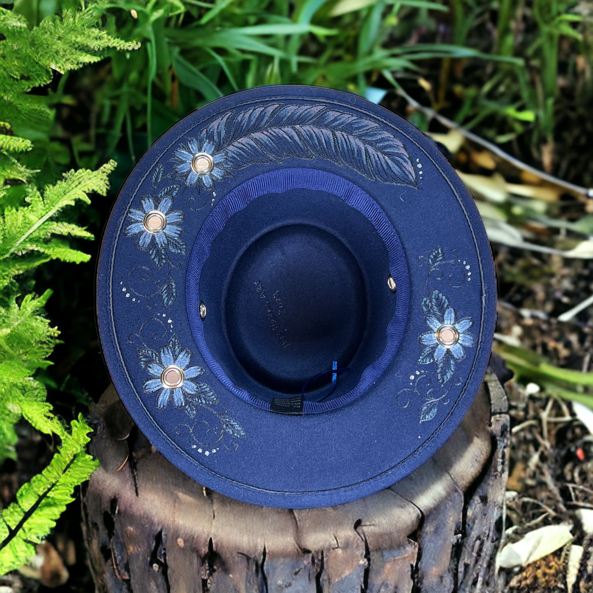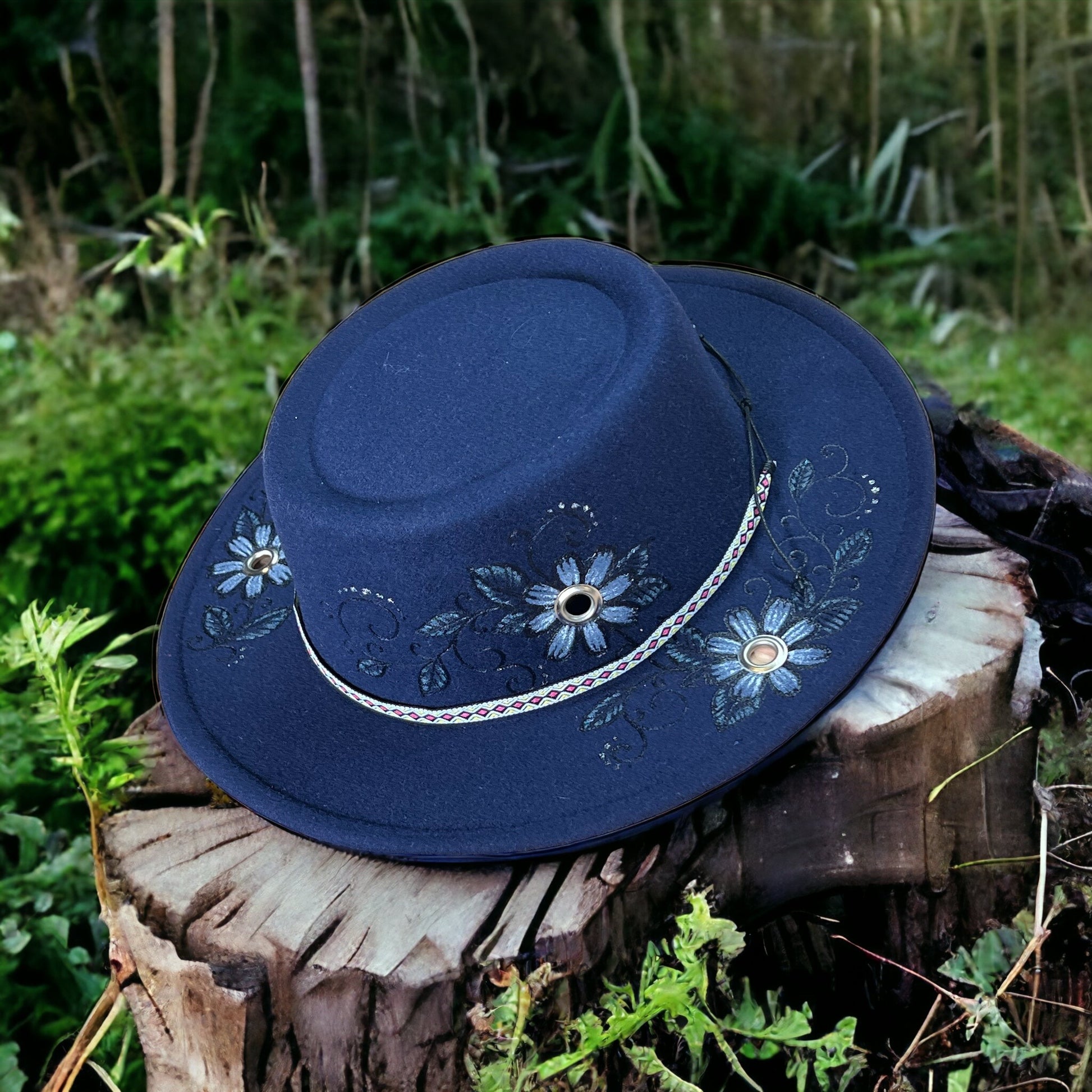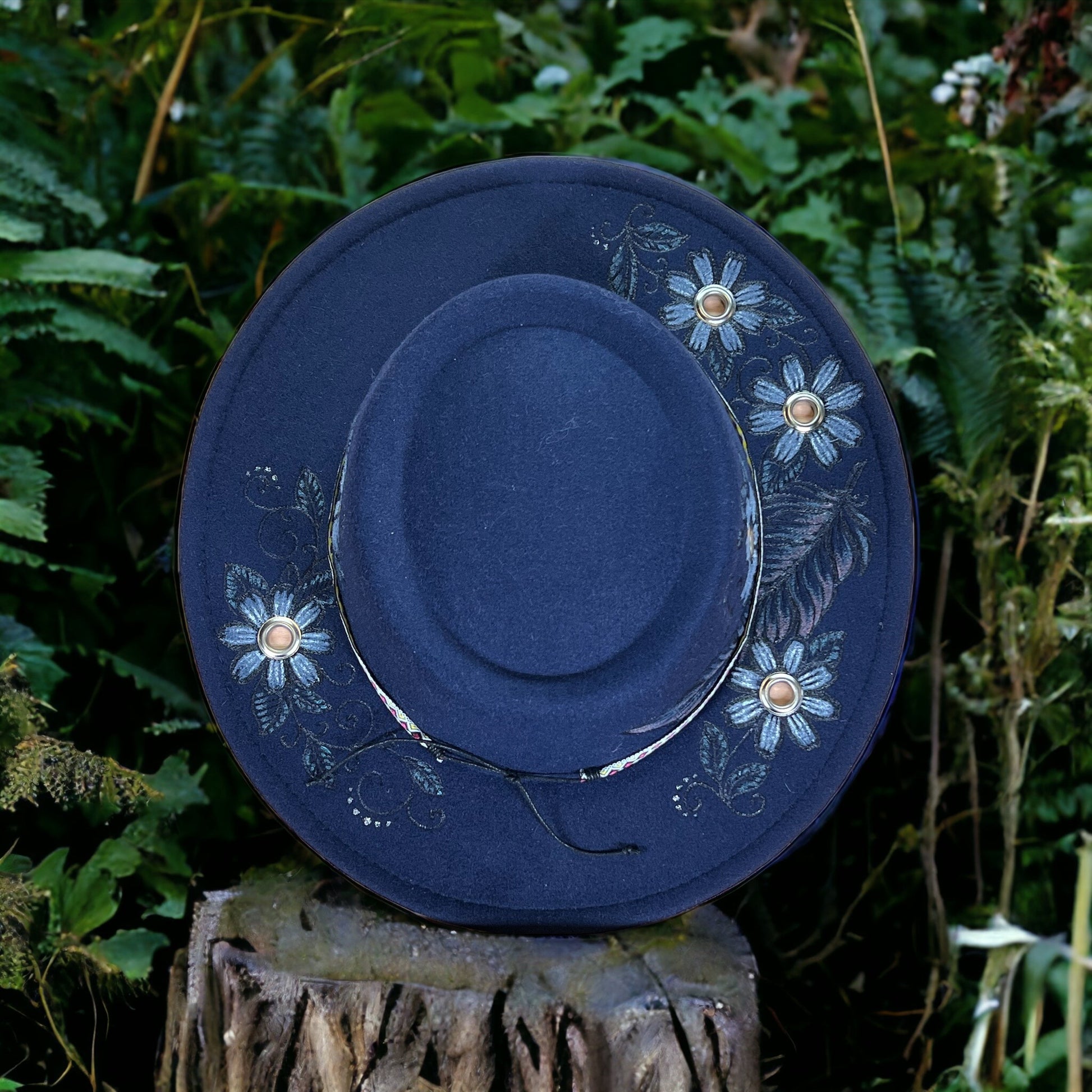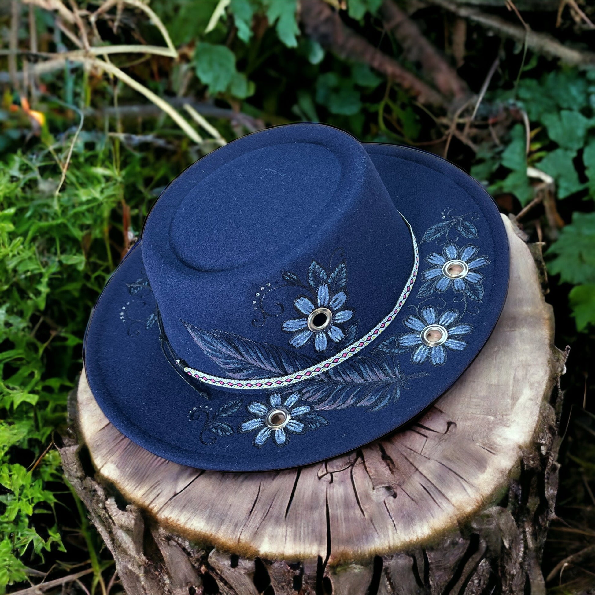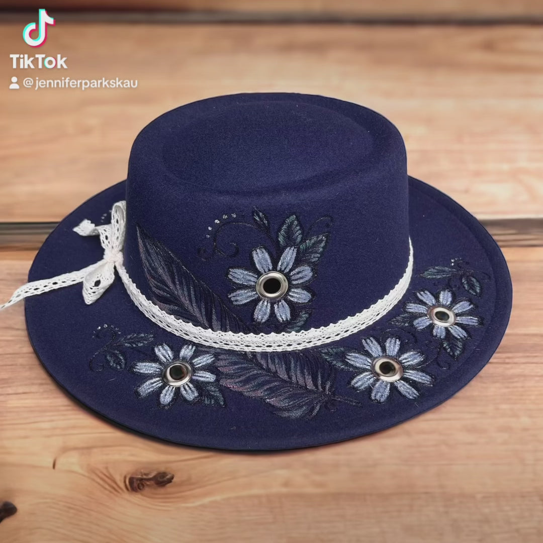 From my hand to your head, each hat goes through a long process of creation, and hours of work goes into just one hat. This is a one of a kind hat, hand burned and then painted with acrylic paint. Daisies dance around the top and bottom of this hat with a feather on the side. Each daisy's center has a grommet hole to add a see through effect.