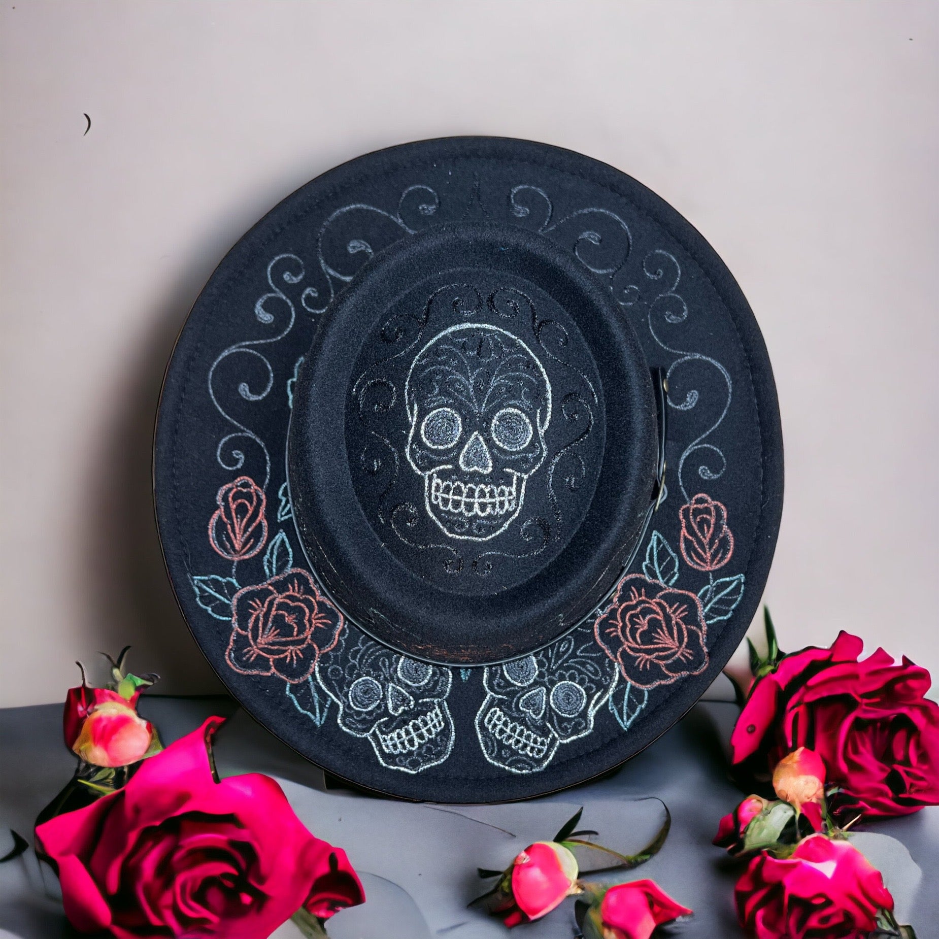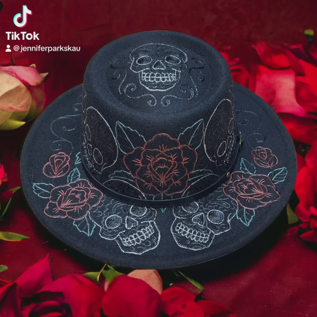 From my hand to your head, each hat goes through a long process of creation, and hours of work goes into just one hat. This is a one of a kind hat, hand burned and then painted with acrylic paint. This entire hat is covered in subtle Day of the Dead sugar skulls and Mexican roses.