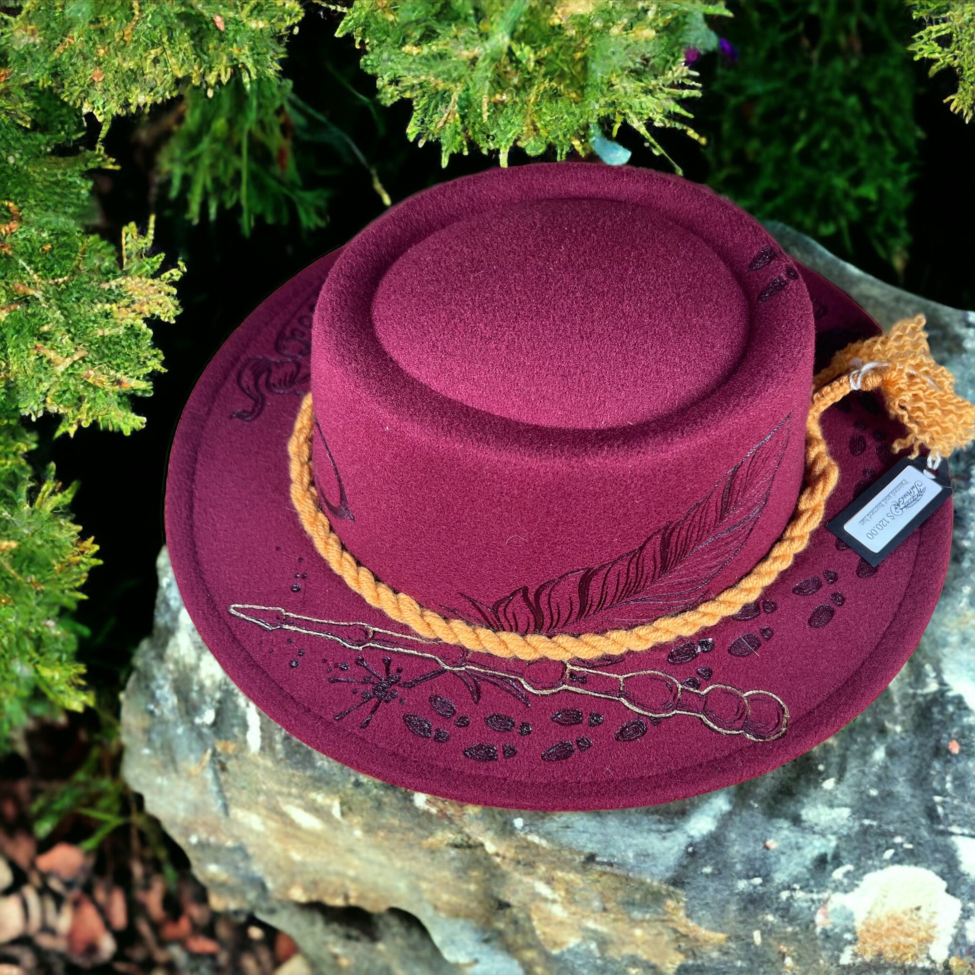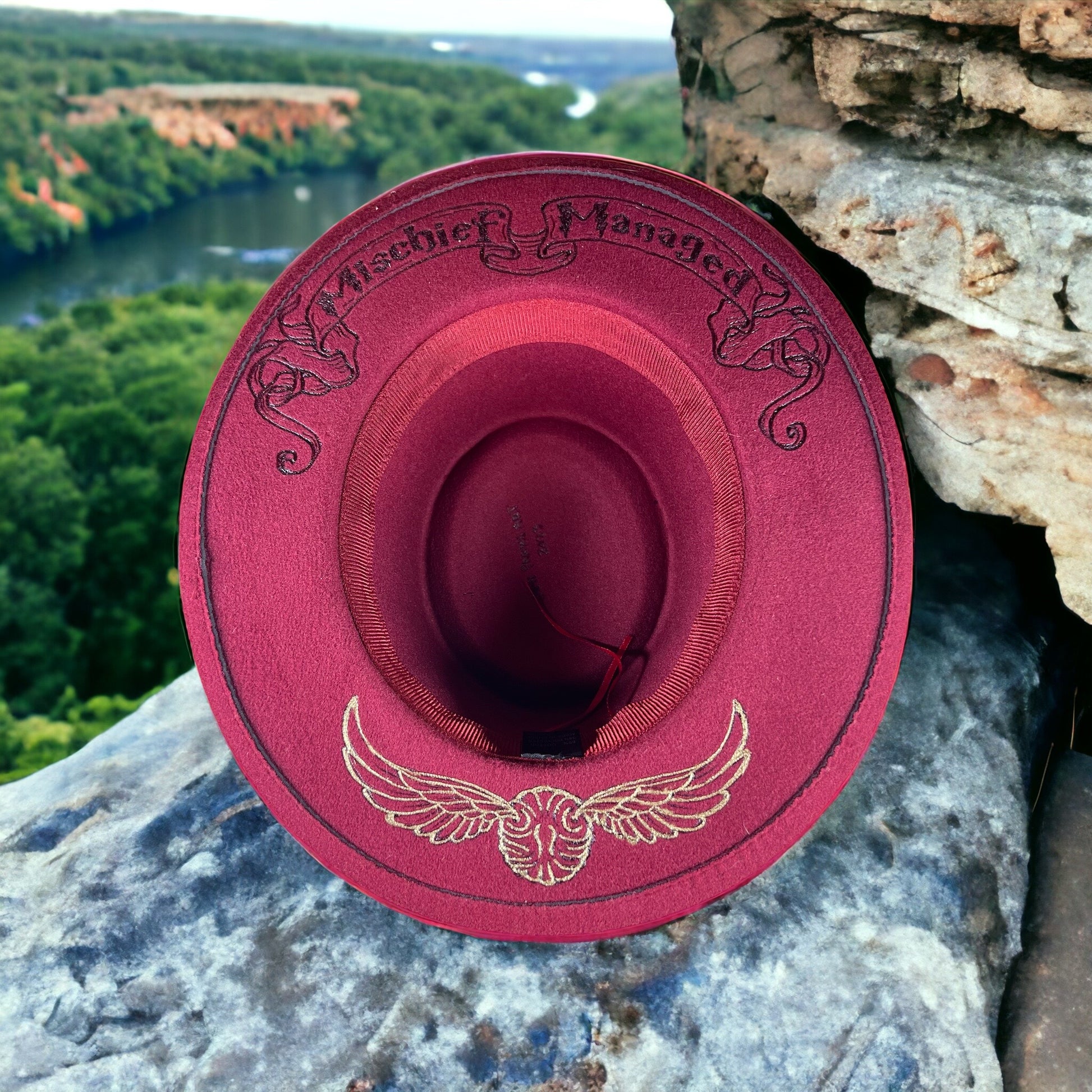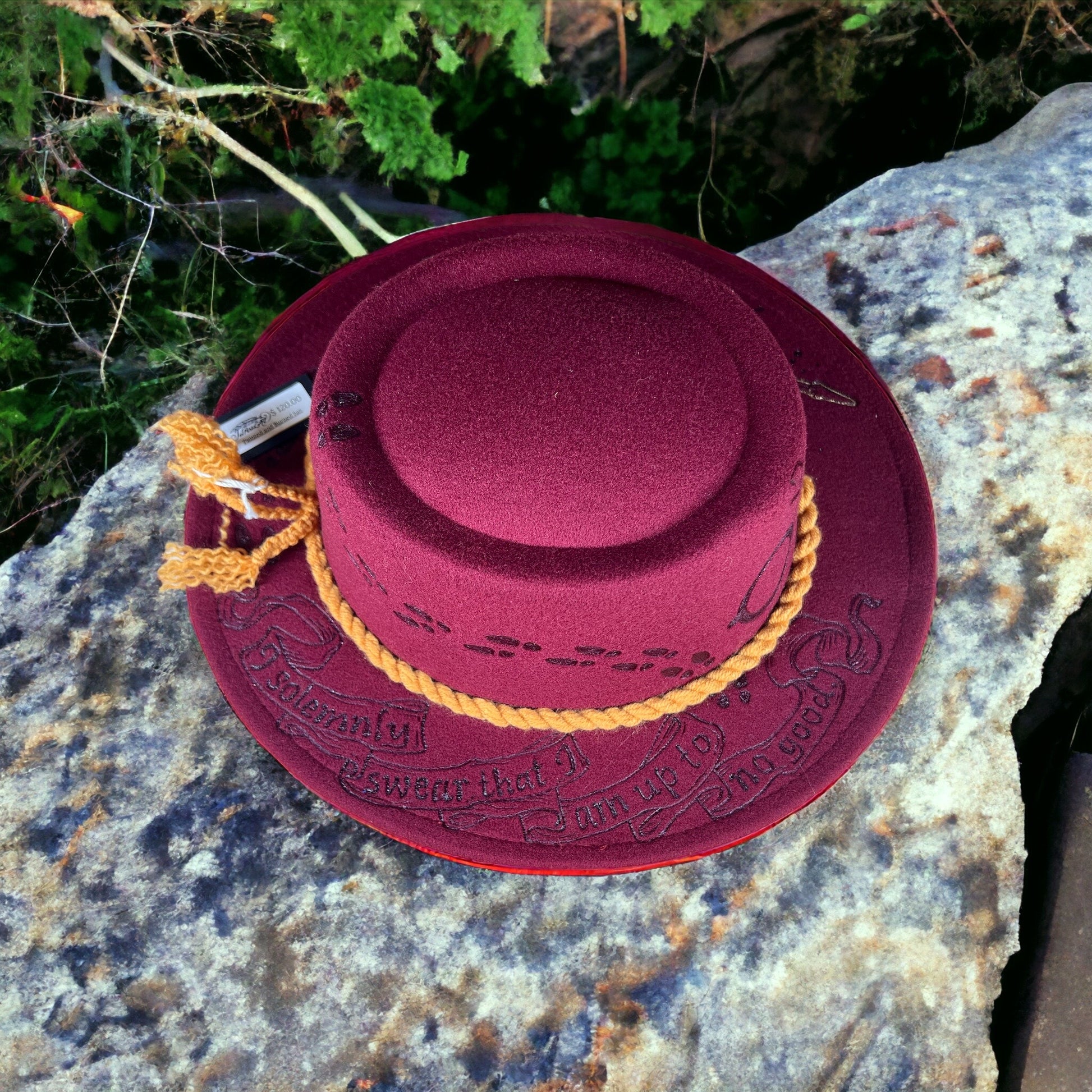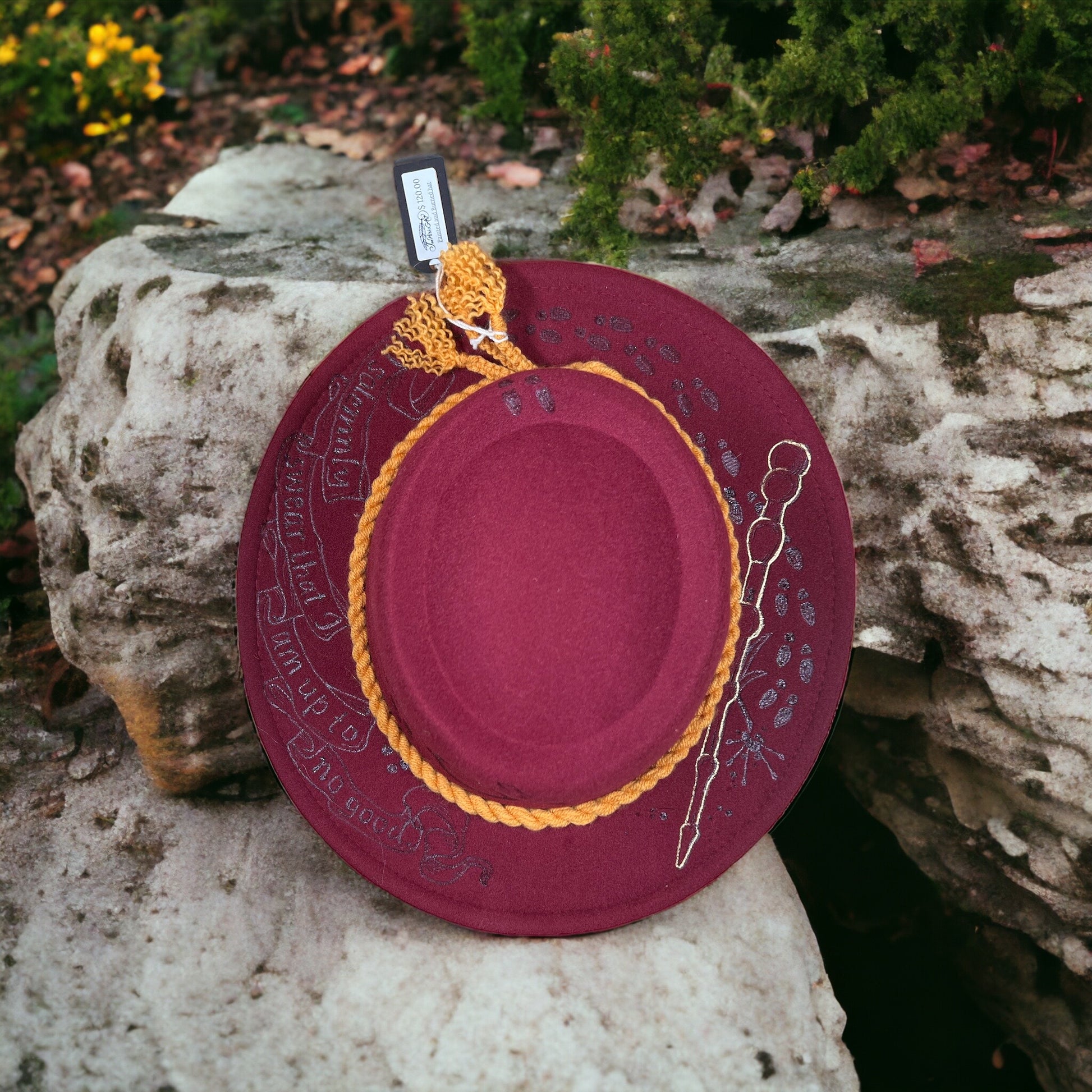 From my hand to your head, each hat goes through a long process of creation, and hours of work goes into just one hat. This is a one of a kind hat, hand burned Harry Potter style symbols.