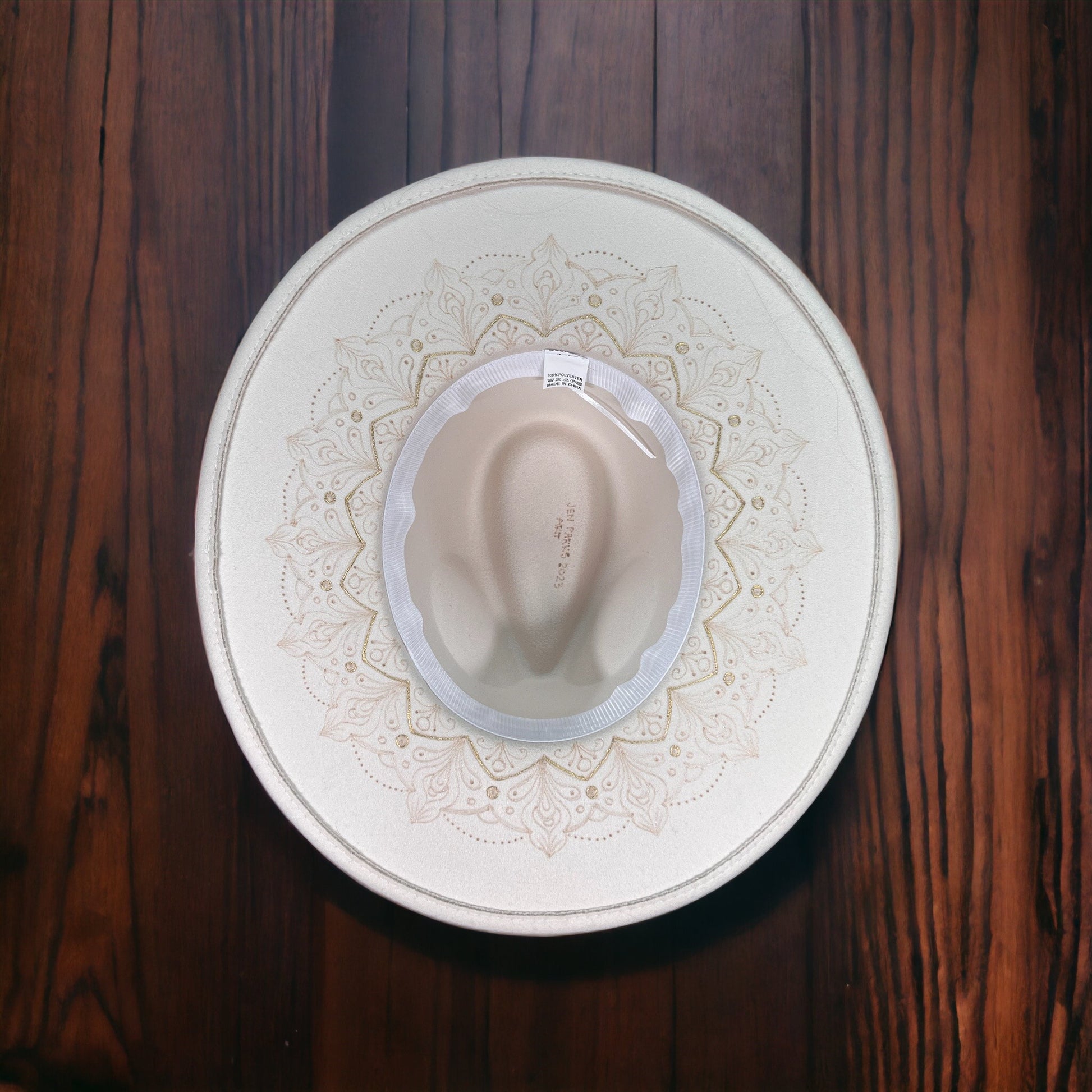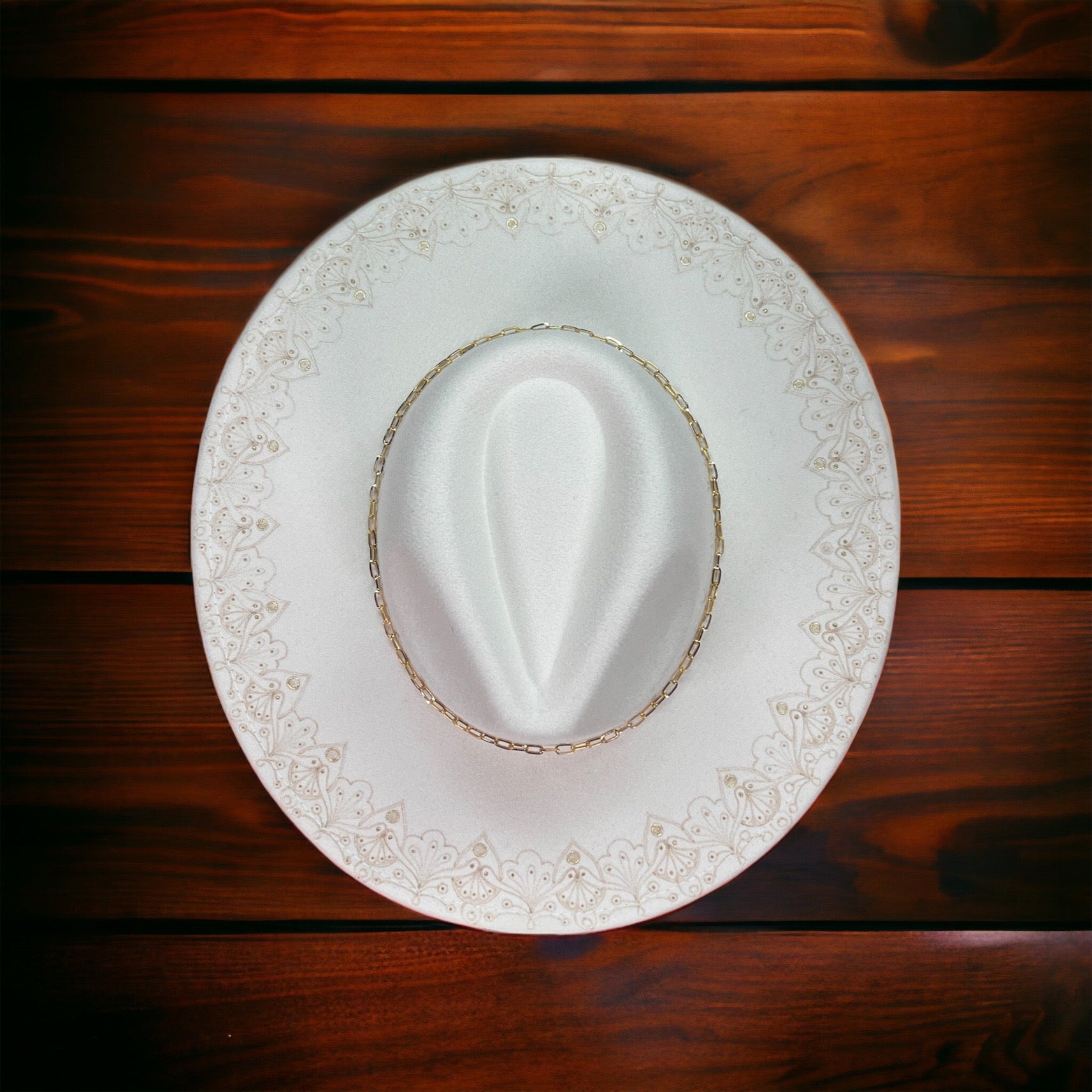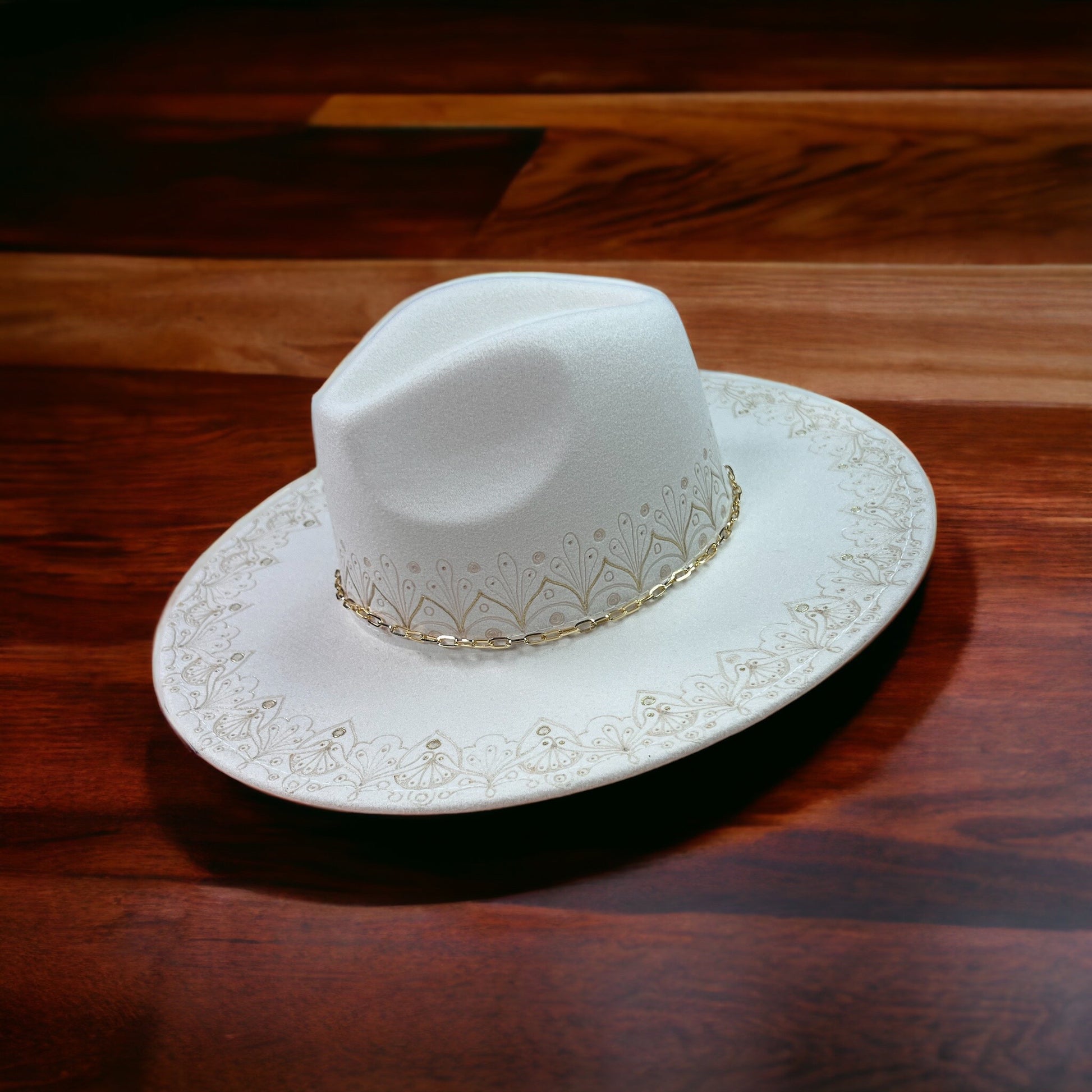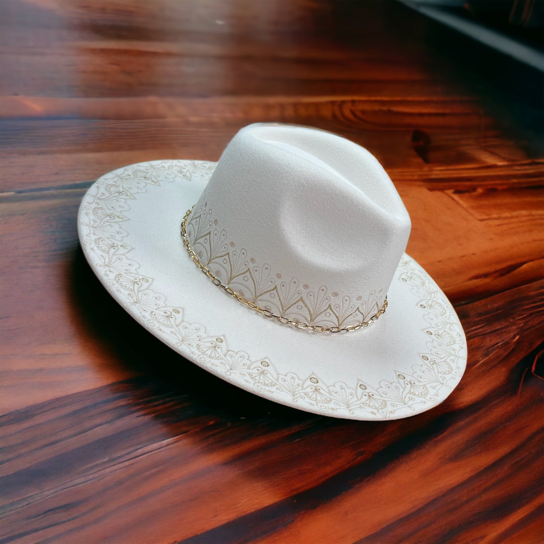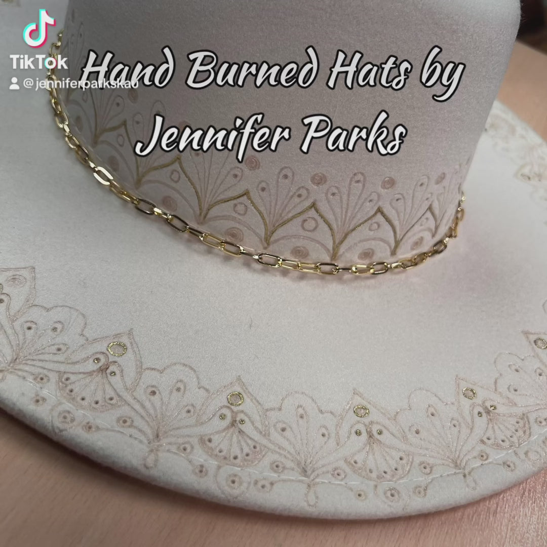From my hand to your head, each hat goes through a long process of creation, and hours of work goes into just one hat. This is a one of a kind hat, hand burned with henna designs, gold painted accents, and a gold chain hat band.