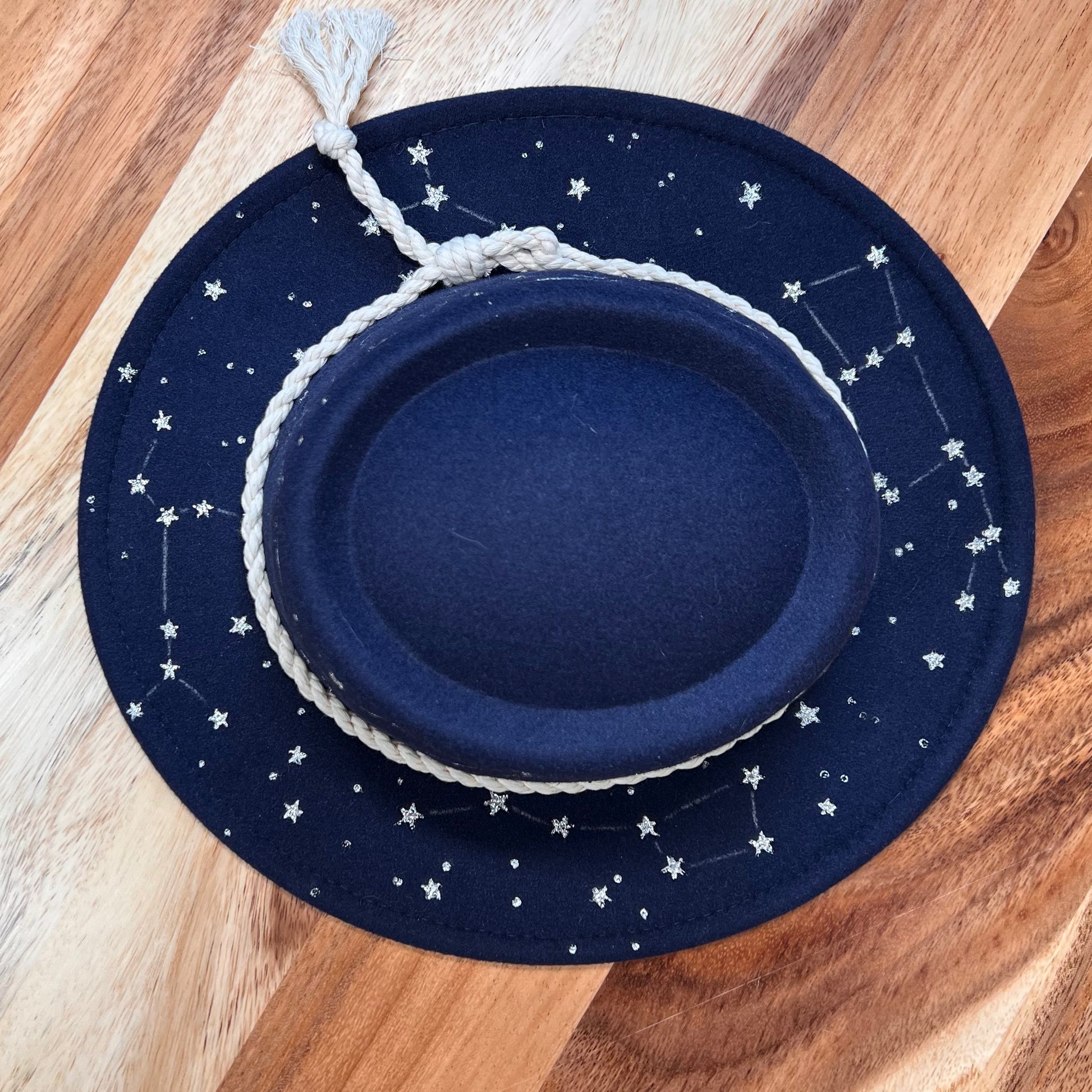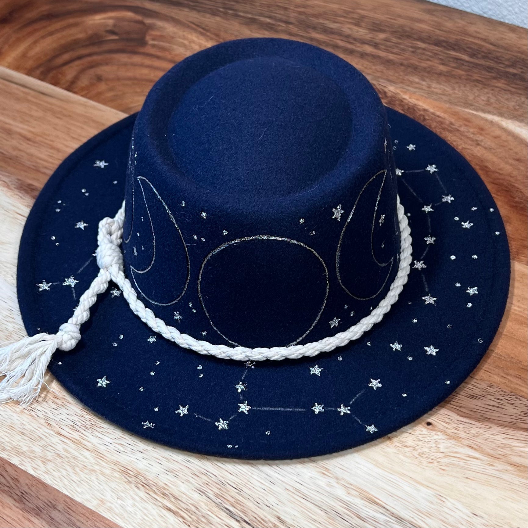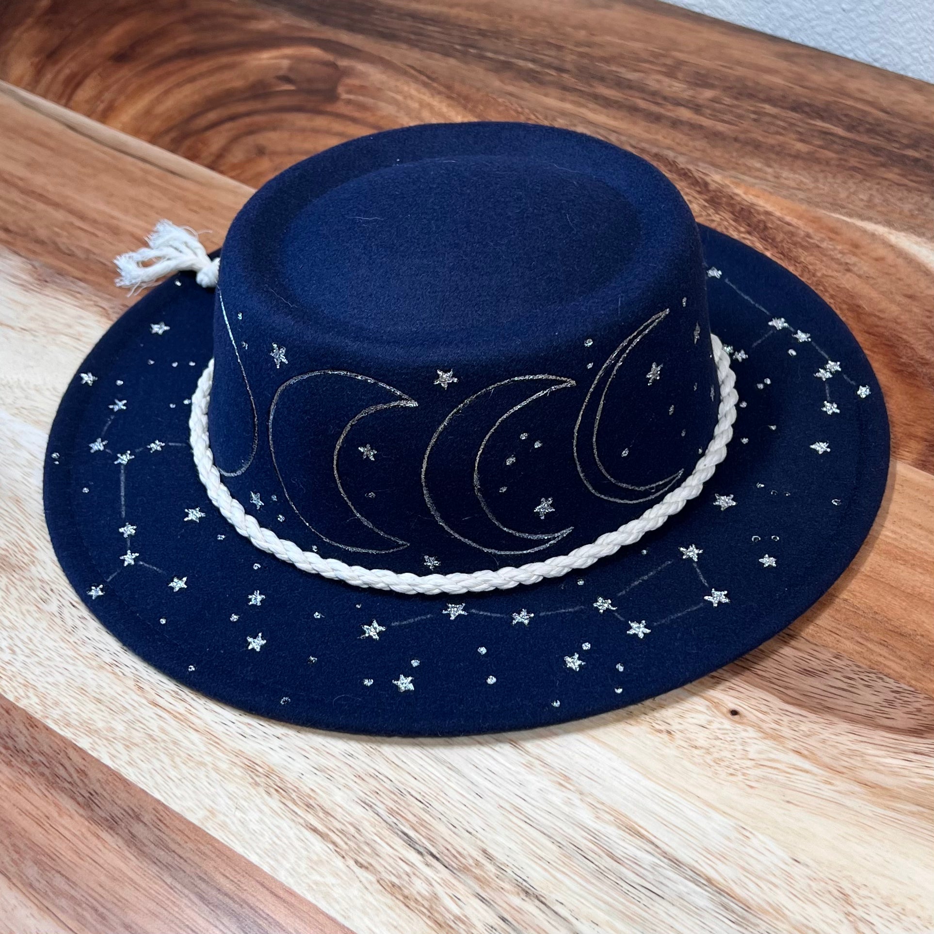 From my hand to your head, each hat goes through a long process of creation, and hours of work goes into just one hat. This is a one of a kind hat, hand burned and painted with the phases of the moon, 4 constellations, and a sun under the brim.