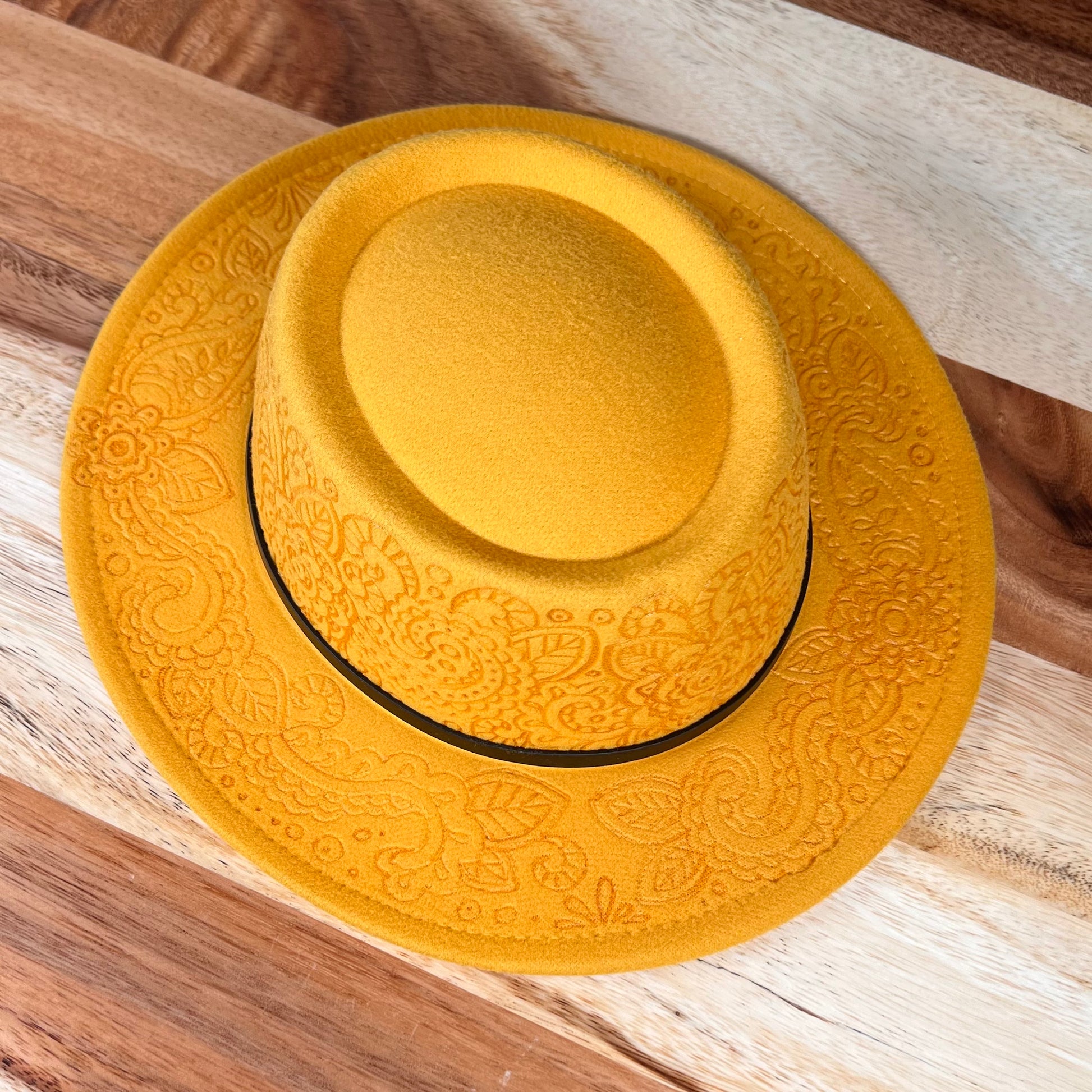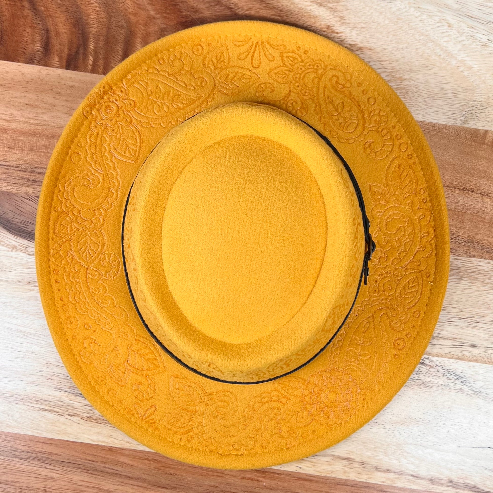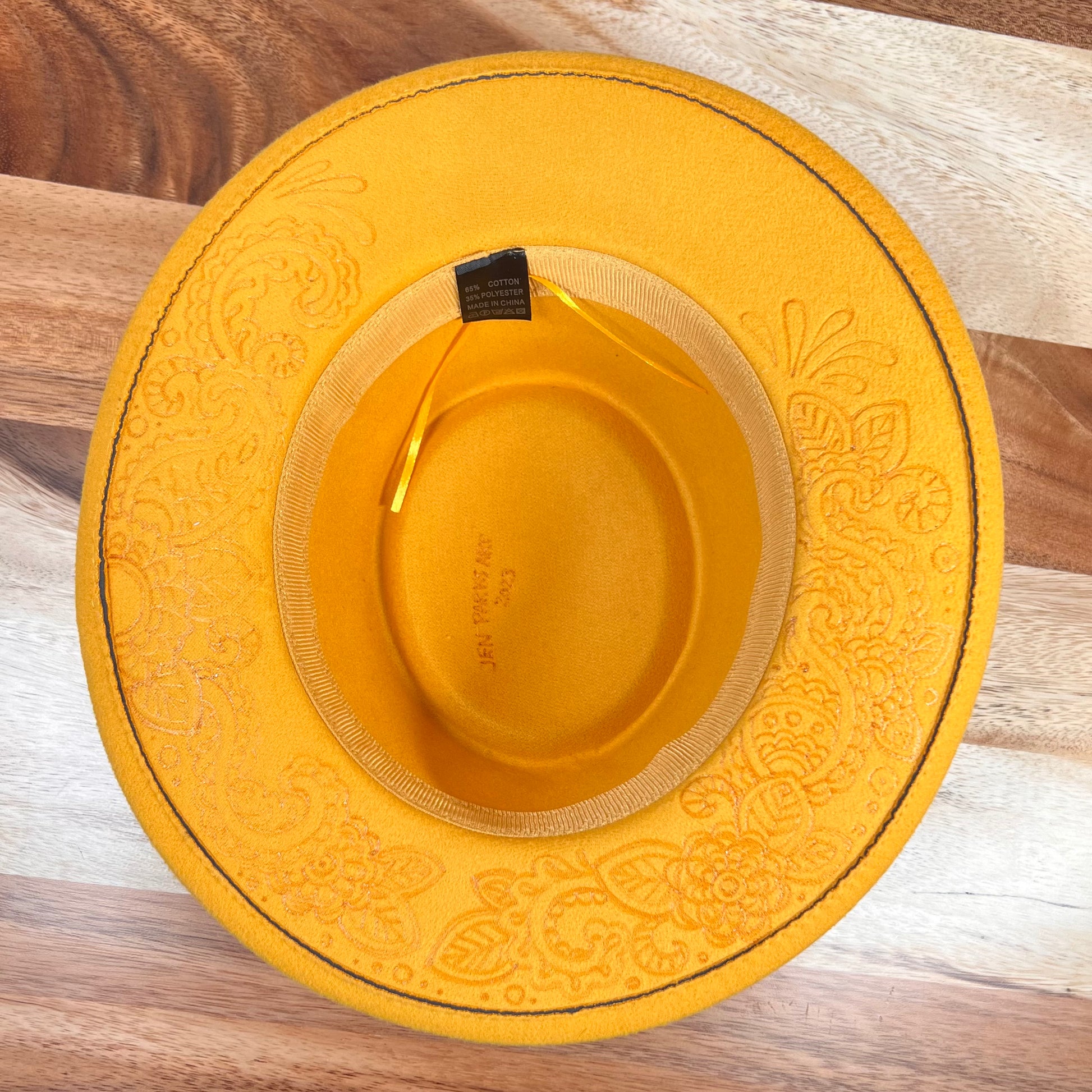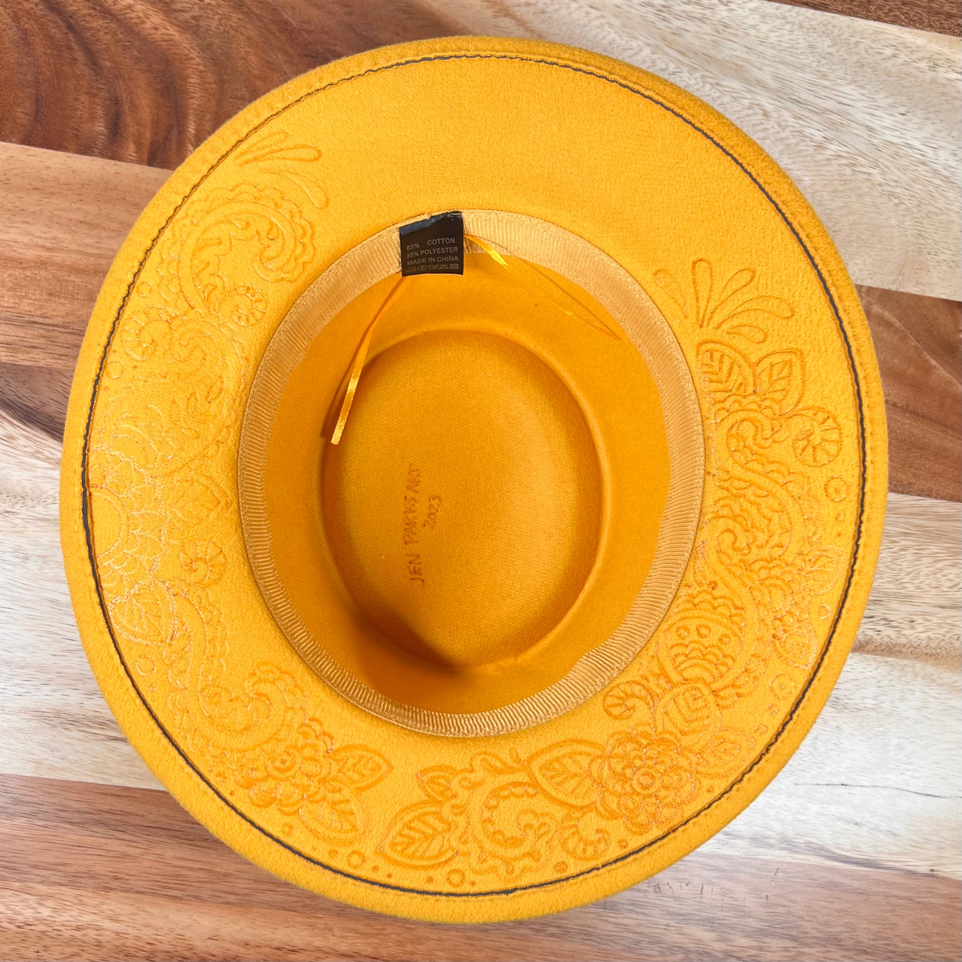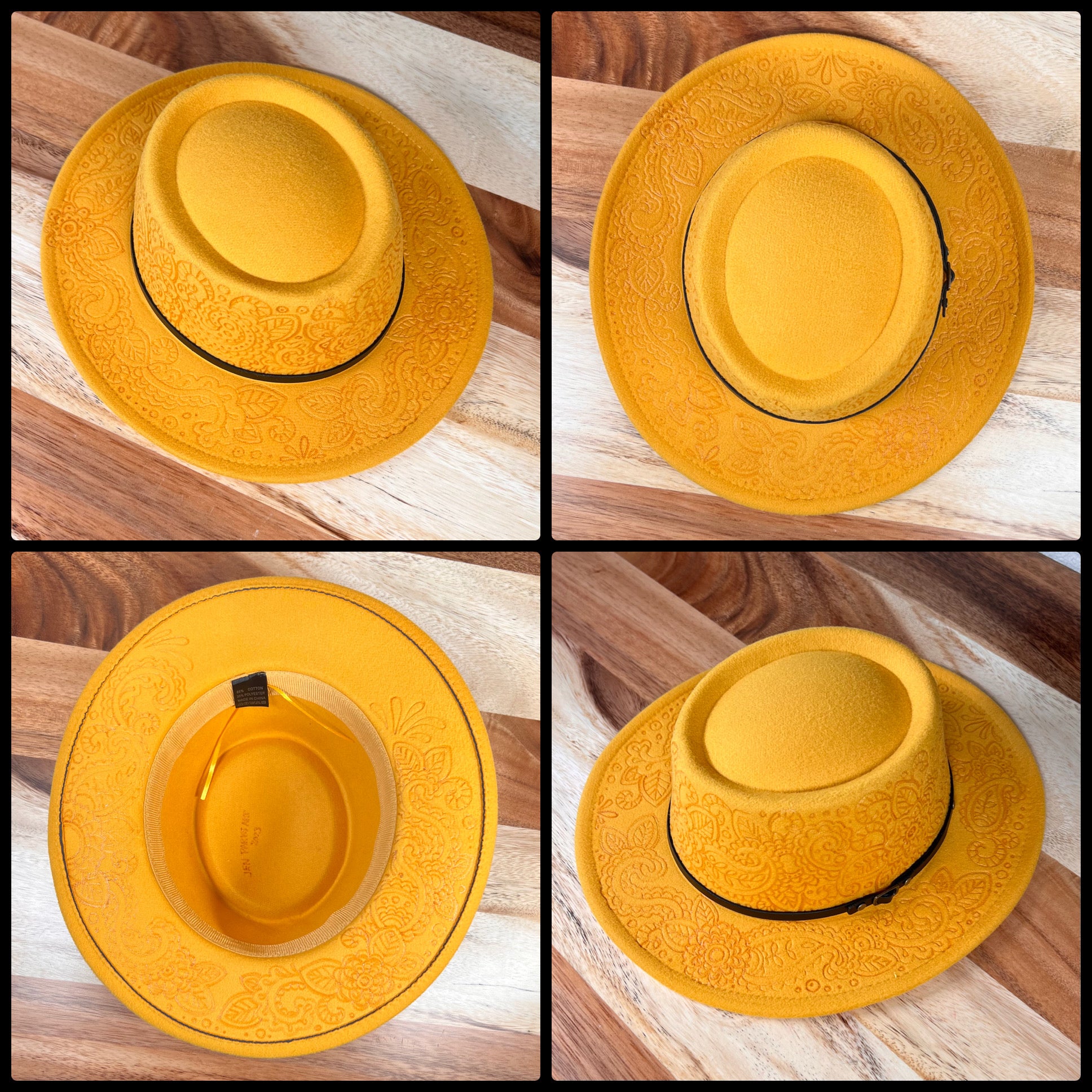 From my hand to your head, each hat goes through a long process of creation, and hours of work goes into just one hat. This is a one of a kind hat, hand burned with Paisley Henna designs on the top and under brim.