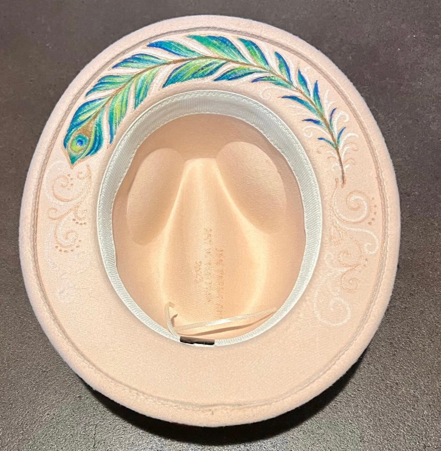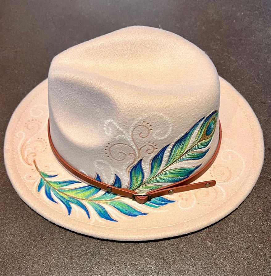 From my hand to your head, each hat goes through a long process of creation, and hours of work goes into just one hat. This is a one of a kind, hand burned and painted fedora. It has bright Peacock feathers hand burned and then painted to the top, rim, and under brim.