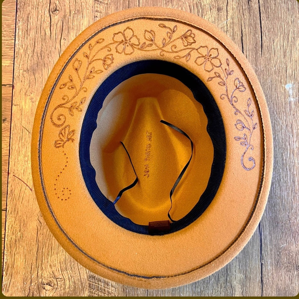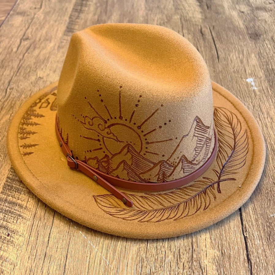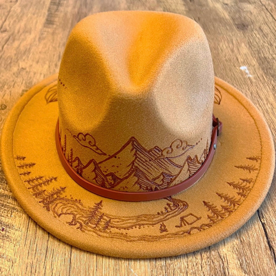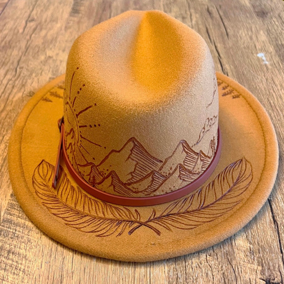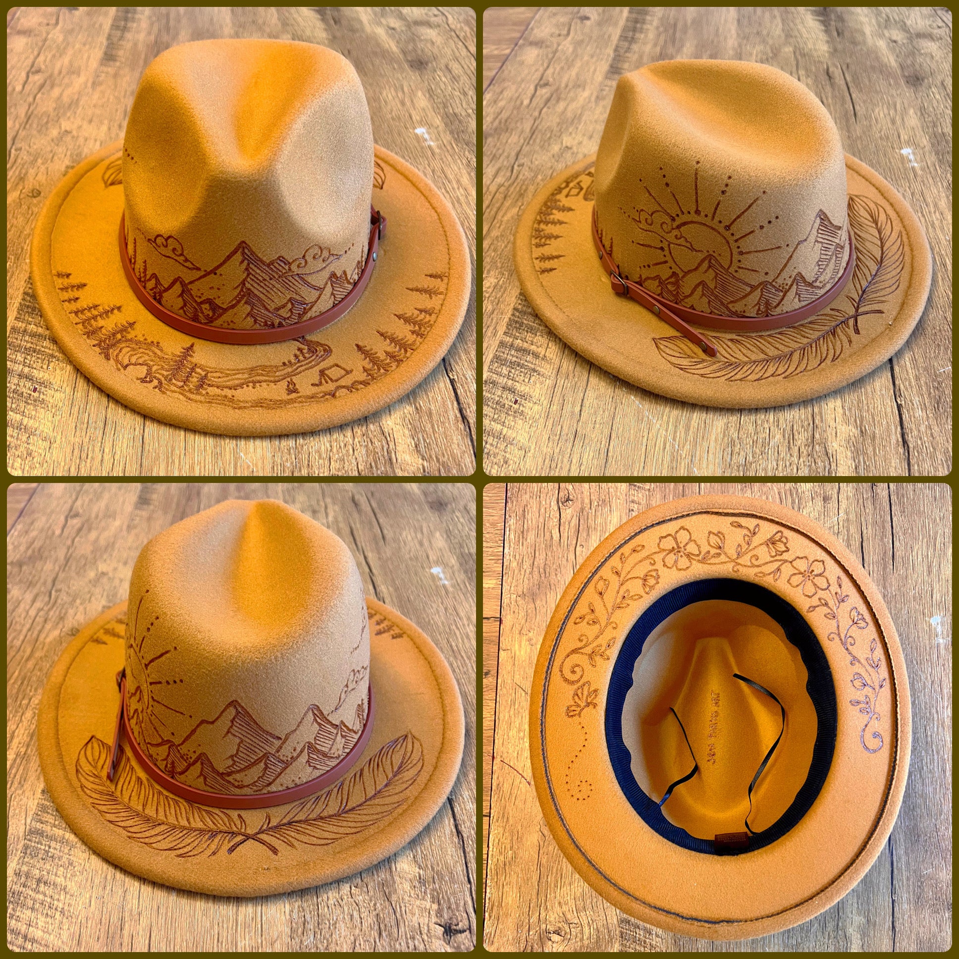 From my hand to your head, each hat goes through a long process of creation, and hours of work goes into just one hat. The top of this one of a kind, hand burned, fedora is adorned with a mountain sunset, a cozy camping spot, and two crossed feathers on the top. Wildflowers and a butterfly decorate the under brim of this stylish hat.